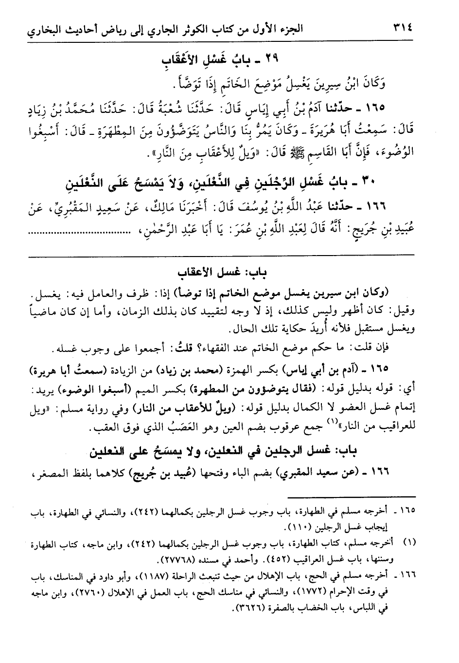 165 - (آدم بن أبي إياس) بكسر الهمزة (محمد بن زياد) من الزيادة (سمعتُ أبا هريرة) أي: قوله بدليل قوله: (فقال يتوضؤون من المطهرة) بكسر الميم (أسبغوا الوضوء) يريد: إتمام غسل العضو لا الكمال بدليل قوله: (ويلٌ للأعقاب من النار) وفي رواية مسلم: "ويل للعراقيب من النار" جمع عرقوب بضم العين وهو العَصَبُ الذي فوق العقب.