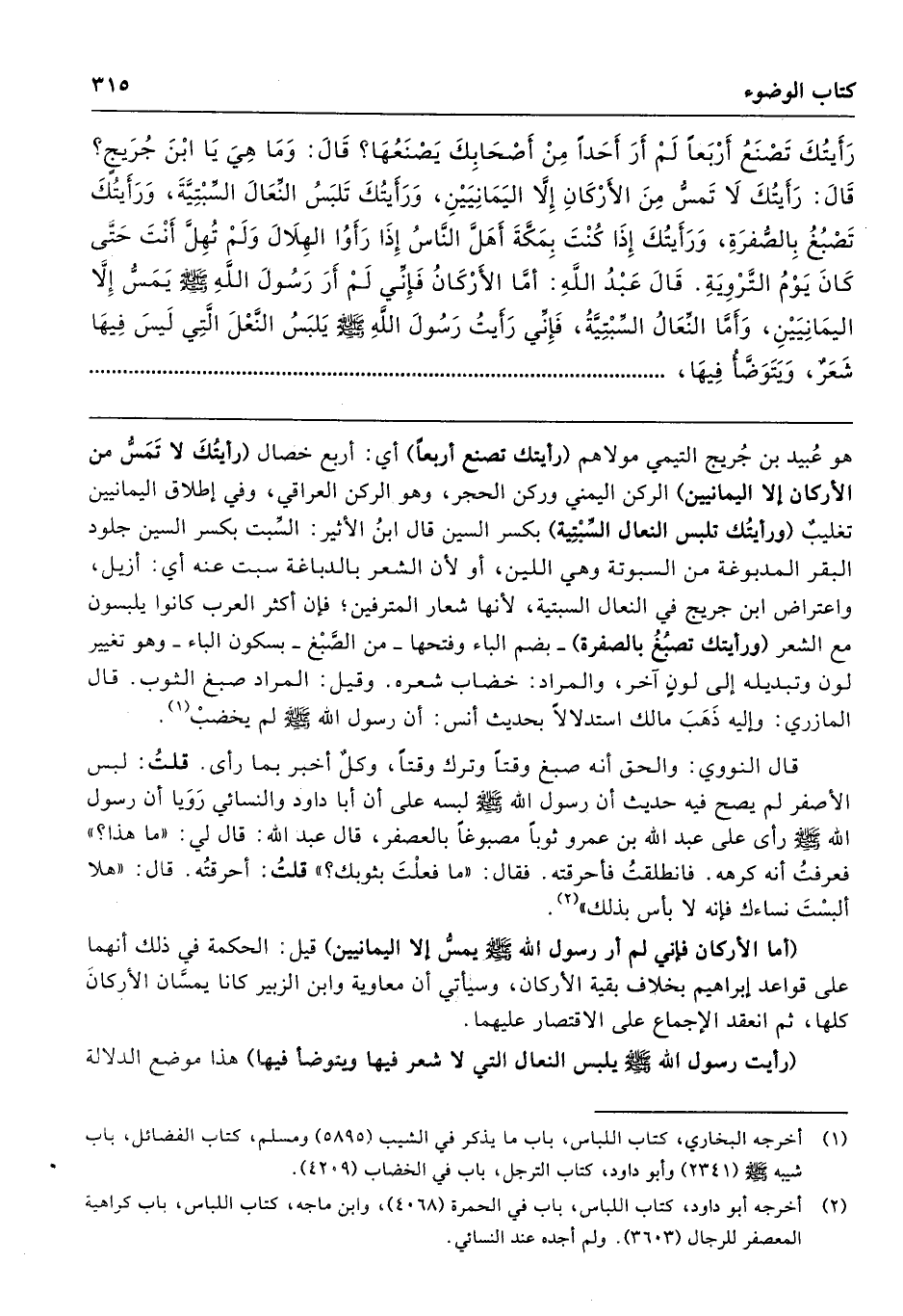 رَأَيْتُكَ تَصْنَعُ أَرْبَعًا لَمْ أَرَ أَحَدًا مِنْ أَصْحَابِكَ يَصْنَعُهَا. قَالَ وَمَا هِىَ يَا ابْنَ جُرَيْجٍ قَالَ رَأَيْتُكَ لاَ تَمَسُّ مِنَ الأَرْكَانِ إِلاَّ الْيَمَانِيَيْنِ، وَرَأَيْتُكَ تَلْبَسُ النِّعَالَ السِّبْتِيَّةَ، وَرَأَيْتُكَ تَصْبُغُ بِالصُّفْرَةِ، وَرَأَيْتُكَ إِذَا كُنْتَ بِمَكَّةَ أَهَلَّ النَّاسُ إِذَا رَأَوُا الْهِلاَلَ وَلَمْ تُهِلَّ أَنْتَ حَتَّى كَانَ يَوْمُ التَّرْوِيَةِ. قَالَ عَبْدُ اللَّهِ أَمَّا الأَرْكَانُ فَإِنِّى لَمْ أَرَ رَسُولَ اللَّهِ - صلى الله عليه وسلم - يَمَسُّ إِلاَّ الْيَمَانِيَيْنِ، وَأَمَّا النِّعَالُ السِّبْتِيَّةُ فَإِنِّى رَأَيْتُ رَسُولَ اللَّهِ - صلى الله عليه وسلم - يَلْبَسُ النَّعْلَ الَّتِى لَيْسَ فِيهَا شَعَرٌ وَيَتَوَضَّأُ فِيهَا،