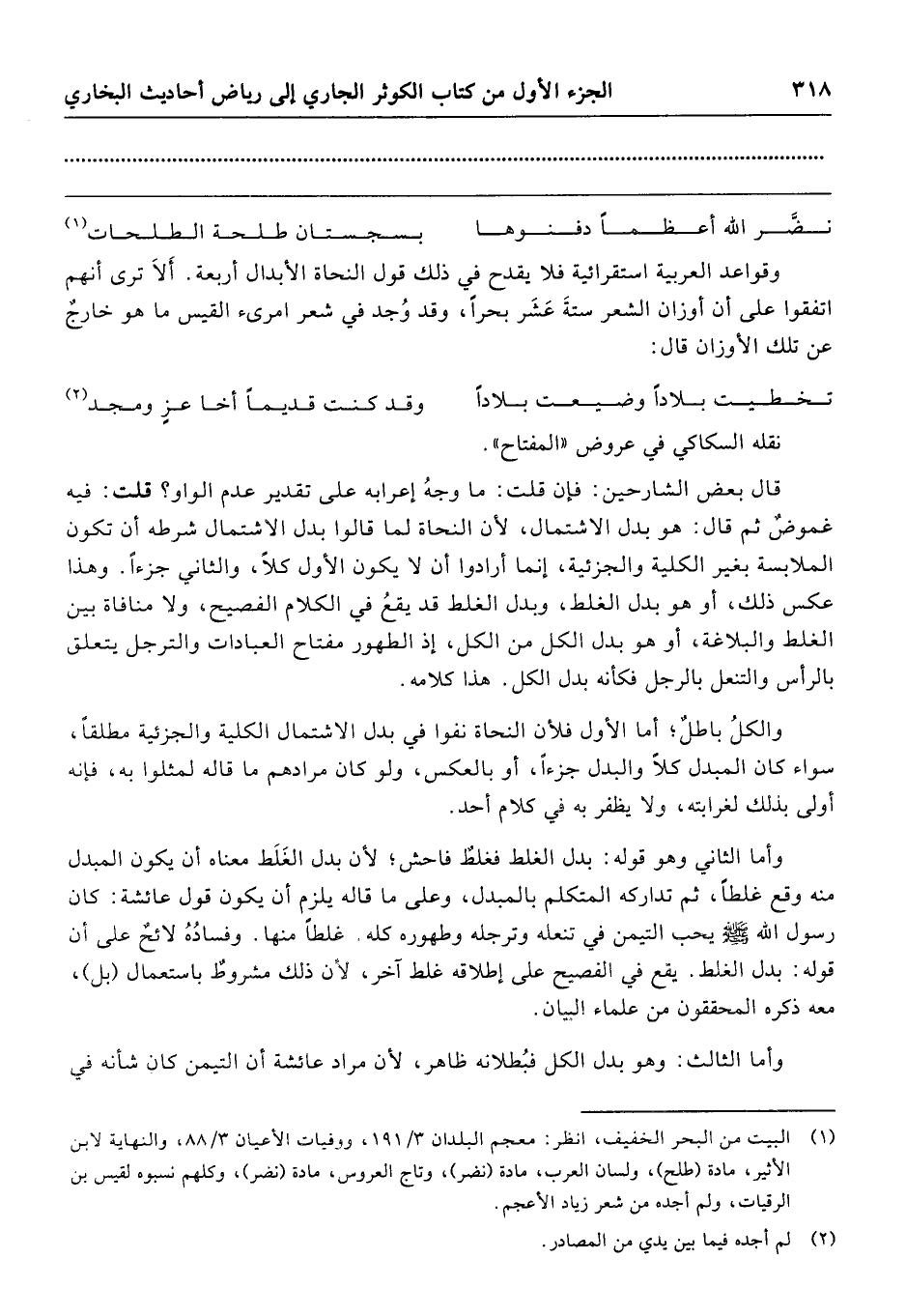 وأما الثاني وهو قوله: بدل الغلط فغلطٌ فاحش؛ لأن بدلا الغَلَط معناه أن يكون المبدل منه وقع غلطًا، ثم تداركه المتكلم بالمبدل، وعلى ما قاله يلزم أن يكون قول عائشة: كان رسول الله - صلى الله عليه وسلم - يحب التيمن في تنعله وترجله وطهوره كله. غلطًا منها. وفسادُهُ لائحٌ على أن قوله: بدل الغلط. يقع في الفصيح على إطلاقه غلط آخر، لأن ذلك مشروطٌ باستعمال (بل)، معه ذكوه المحققون من علماء البيان.