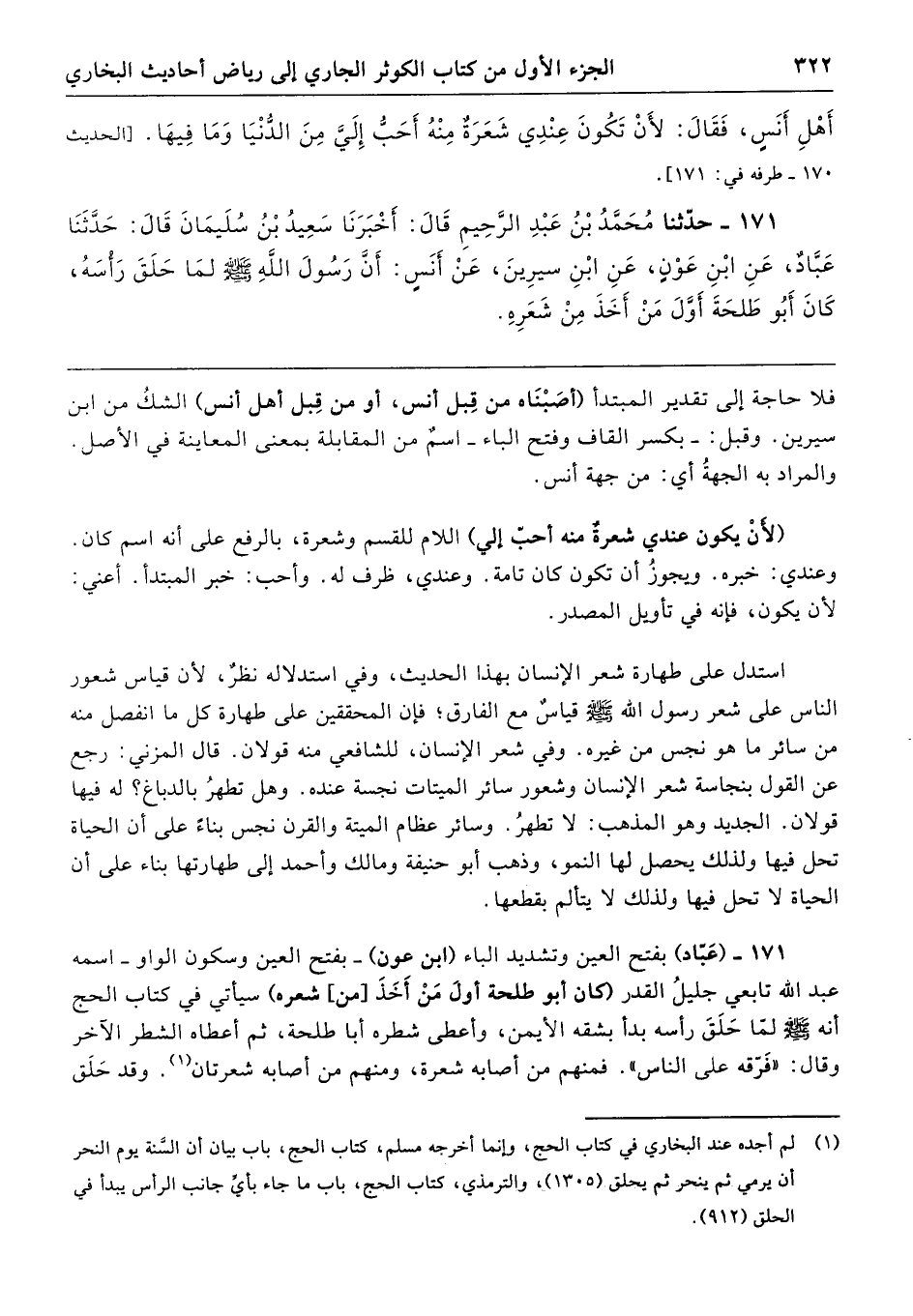 171 - (عَبّاد) بفتح العين وتشديد الباء (ابن عون) -بفتح العين وسكون الواو- اسمه عبد الله تابعي جليلُ القدر (كان أبو طلحة أولَ مَنْ أَخَذَ [من] شعره) سيأتي في كتاب الحج أنه - صلى الله عليه وسلم - لمّا حَلَقَ رأسه بدأ بشقه الأيمن، وأعطى شطره أبا طلحة، ثم أعطاه الشطر الآخر وقال: "فَرّقه على الناس". فمنهم من أصابه شعرة، ومنهم من أصابه شعرتان. وقد حَلَق