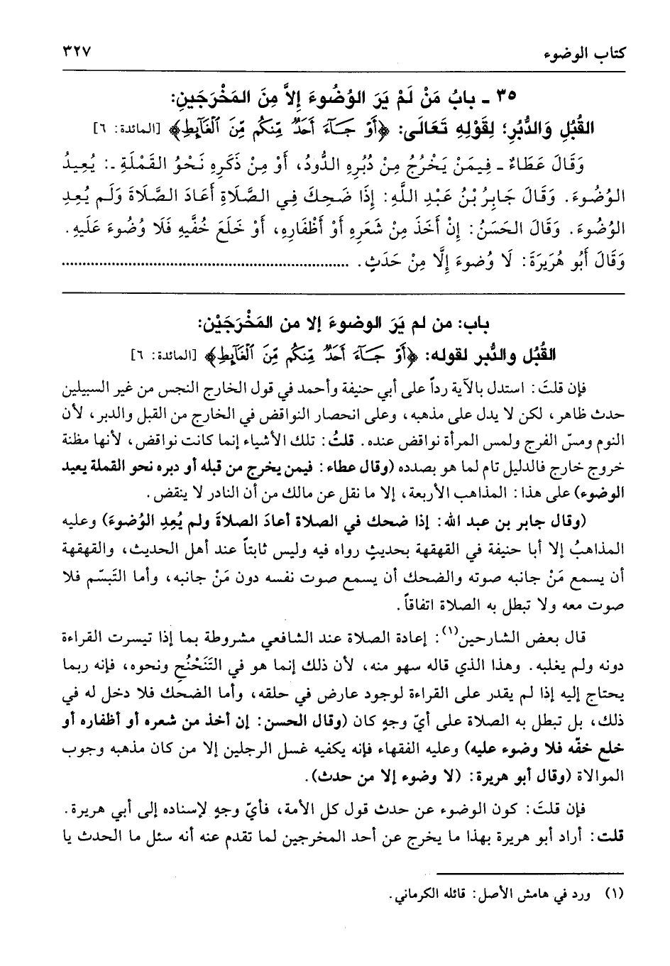 باب: من لم يَرَ الوضوءَ إلا من المَخْرَجَيْن: القُبُل والدُّبر لقوله: {أَوْ جَاءَ أَحَدٌ مِنْكُمْ مِنَ الْغَائِطِ} [المائده: 6]