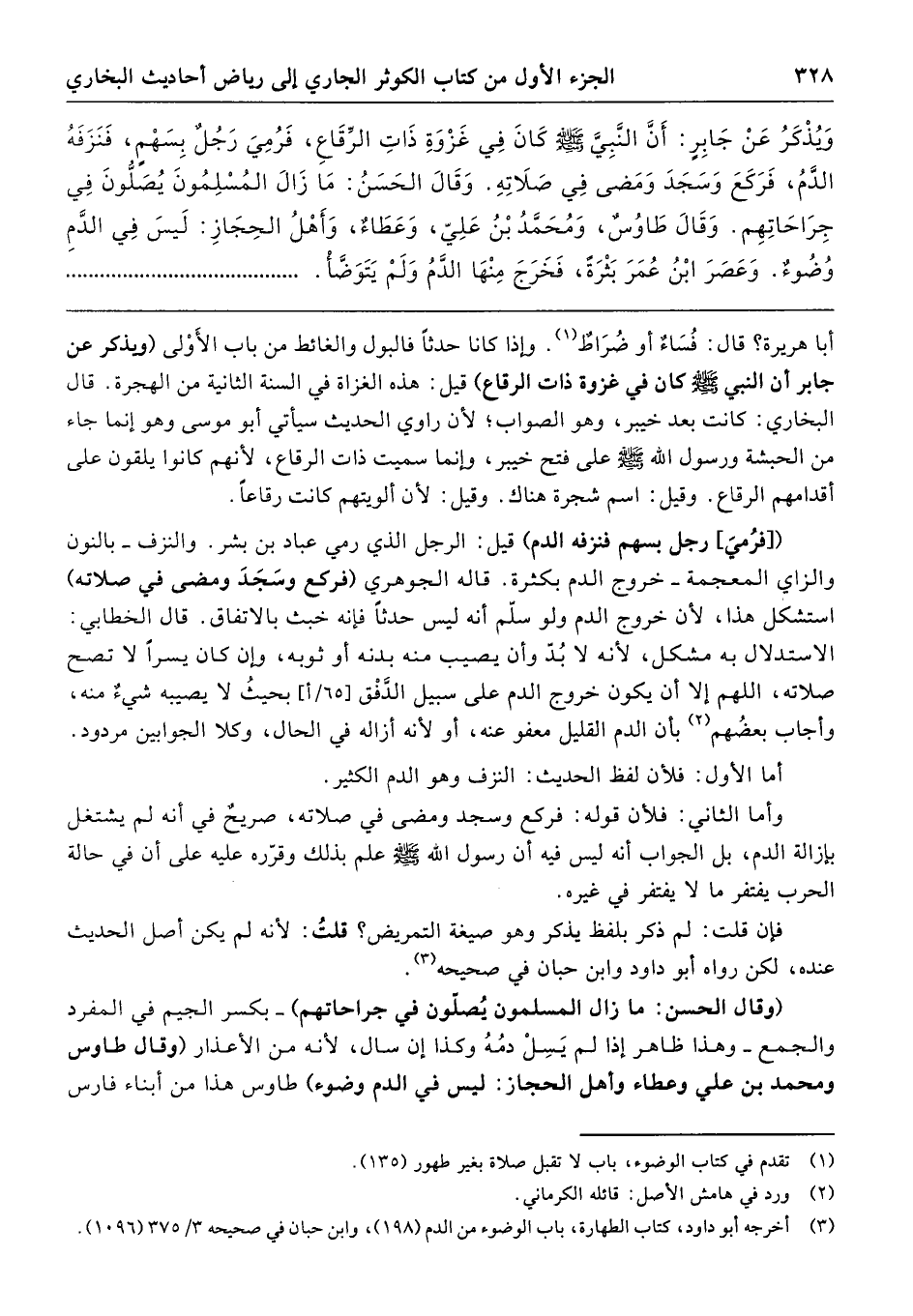 وَيُذْكَرُ عَنْ جَابِرٍ أَنَّ النَّبِىَّ - صلى الله عليه وسلم - كَانَ فِي غَزْوَةِ ذَاتِ الرِّقَاعِ فَرُمِىَ رَجُلٌ بِسَهْمٍ، فَنَزَفَهُ الدَّمُ فَرَكَعَ وَسَجَدَ، وَمَضَى فِي صَلاَتِهِ. وَقَالَ الْحَسَنُ مَا زَالَ الْمُسْلِمُونَ يُصَلُّونَ فِي جِرَاحَاتِهِمْ. وَقَالَ طَاوُسٌ وَمُحَمَّدُ بْنُ عَلِىٍّ وَعَطَاءٌ وَأَهْلُ الْحِجَازِ لَيْسَ فِي الدَّمِ وُضُوءٌ. وَعَصَرَ ابْنُ عُمَرَ بَثْرَةً فَخَرَجَ مِنْهَا الدَّمُ، وَلَمْ يَتَوَضَّأْ.