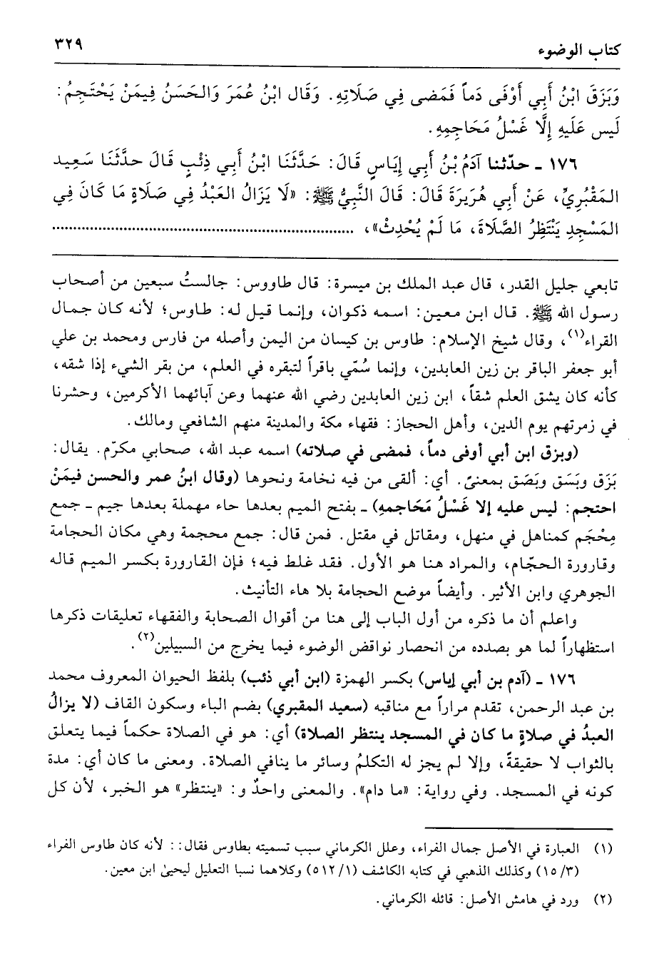 176 - (آدم بن أبي إياس) بكسر الهمزة (ابن أبي ذئب) بلفظ الحيوان المعروف محمد بن عبد الرحمن، تقدم مرارًا مع مناقبه (سعيد المقبري) بضم الباء وسكون القاف (لا يزالُ العبدُ في صلاةٍ ما كان في المسجد ينتظر الصلاة) أي: هو في الصلاة حكمًا فيما يتعلق بالثواب لا حقيقةً، وإلا لم يجز له التكلمُ وسائر ما ينافي الصلاة. ومعنى ما كان أي: مدة كونه في المسجد. وفي رواية: "ما دام". والمعنى واحدٌ و: "ينتظر" هو الخبر، لأن كل