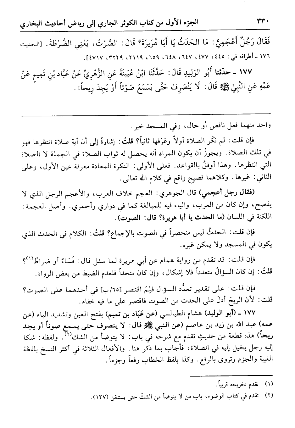 177 - (أبو الوليد) هشام الطيالسي (عن عَبّاد بن تميم) بفتح العين وتشديد الباء (عن عمه) عبد الله بن زيد بن عاصم (عن النبي - صلى الله عليه وسلم - قال: لا ينصرف حتى يسمع صوتًا أو يجد ريحًا) هذه قطعة من حديثٍ تقدم مع شرحه في باب: لا يتوضأ من الشك. ولفظه: شكا إليه رجل يخيل إليه في الصلاة، فأجاب بما ذكر هنا. والأفعال الثلاثة في أكثر النسخ بلفظة الغيبة والجزم وتروى بالرفع. وكذا بلفظ الخطاب رفعًا وجزمًا.