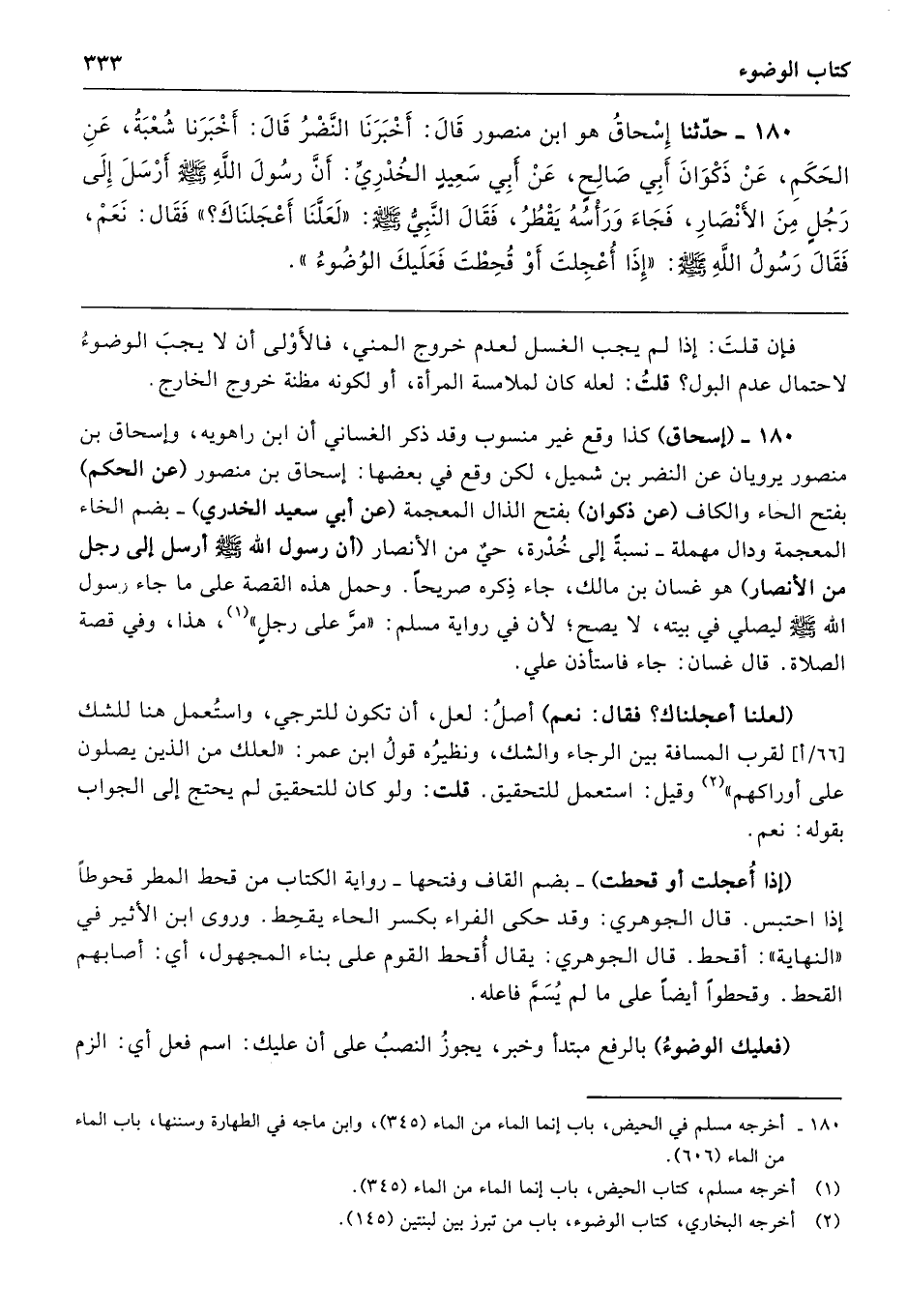 180 - حَدَّثَنَا إِسْحَاقُ قَالَ أَخْبَرَنَا النَّضْرُ قَالَ أَخْبَرَنَا شُعْبَةُ عَنِ الْحَكَمِ عَنْ ذَكْوَانَ أَبِى صَالِحٍ عَنْ أَبِى سَعِيدٍ الْخُدْرِىِّ أَنَّ رَسُولَ اللَّهِ - صلى الله عليه وسلم - أَرْسَلَ إِلَى رَجُلٍ مِنَ الأَنْصَارِ فَجَاءَ وَرَأْسُهُ يَقْطُرُ، فَقَالَ النَّبِىُّ - صلى الله عليه وسلم - «لَعَلَّنَا أَعْجَلْنَاكَ». فَقَالَ نَعَمْ. فَقَالَ رَسُولُ اللَّهِ - صلى الله عليه وسلم - «إِذَا أُعْجِلْتَ أَوْ قُحِطْتَ، فَعَلَيْكَ الْوُضُوءُ».