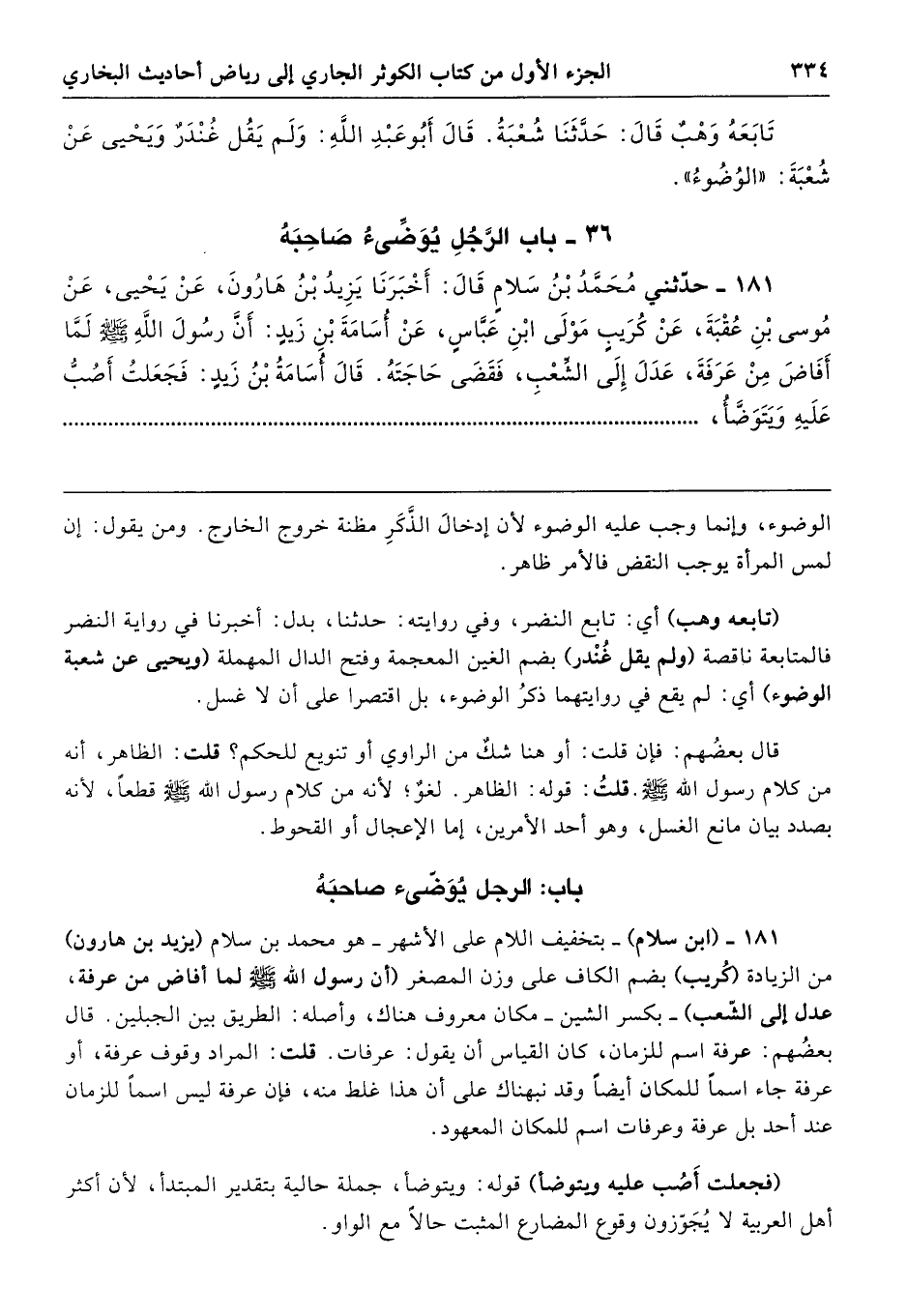 181 - (ابن سلام) -بتخفيف اللام على الأشهر - هو محمد بن سلام (يزيد بن هارون) من الزيادة (كُريب) بضم الكاف على وزن المصغر (أن رسول الله - صلى الله عليه وسلم - لما أفاض من عرفة، عدل إلى الشّعب) -بكسر الشين- مكان معروف هناك، وأصله: الطريق بين الجبلين. قال بعضُهم: عرفة اسم للزمان، كان القياس أن يقول: عرفات. قلت: المراد وقوف عرفة، أو عرفة جاء اسمًا للمكان أيضًا وقد نبهناك على أن هذا غلط منه، فإن عرفة ليس اسمًا للزمان عند أحد بل عرفة وعرفات اسم للمكان المعهود.