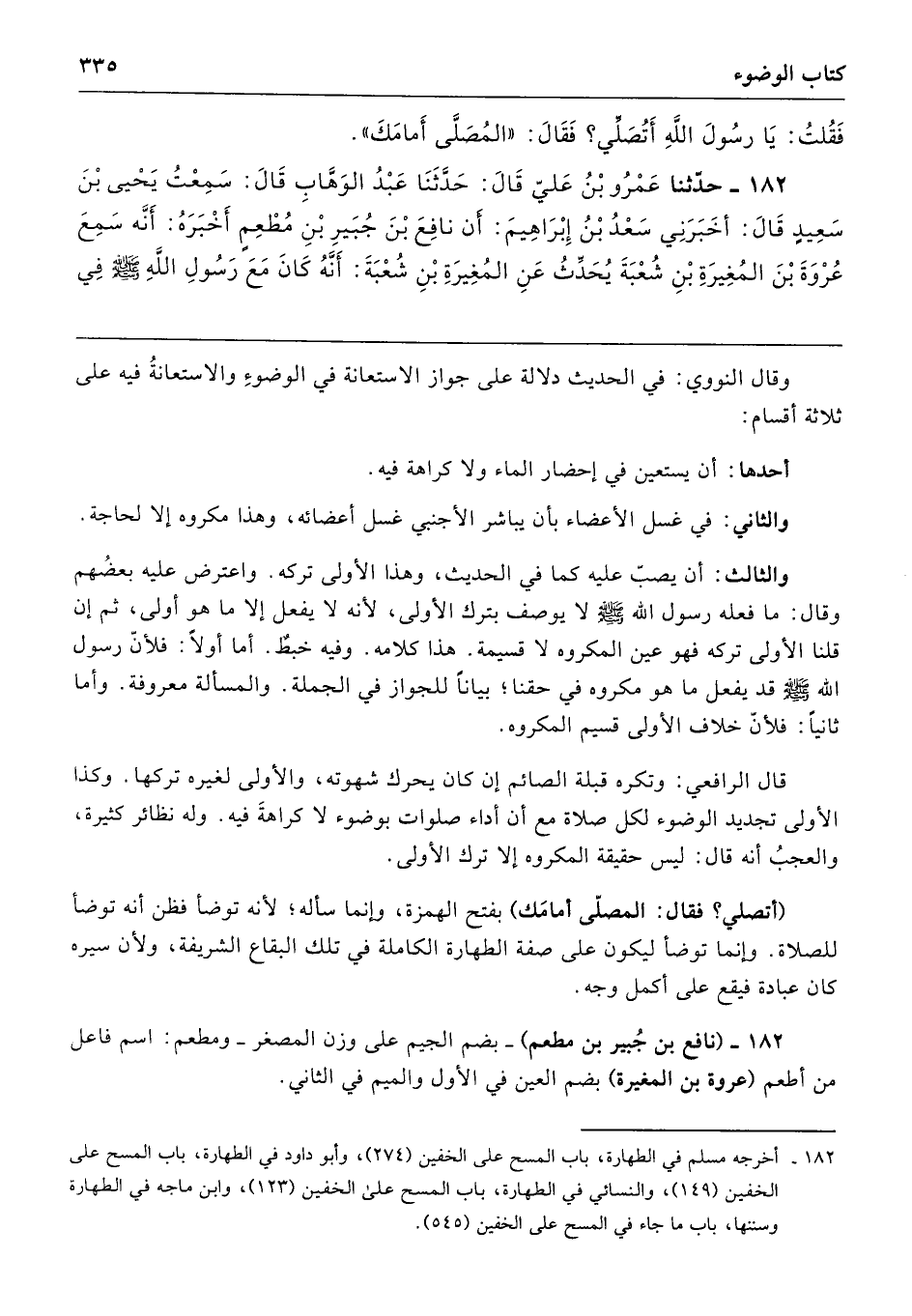 182 - (نافع بن جبير بن مطعم) -بضم الجيم على وزن المصغر- ومطعم: اسم فاعل من أطعم (عروة بن المغيرة) بضم العين في الأول والميم في الثاني.
