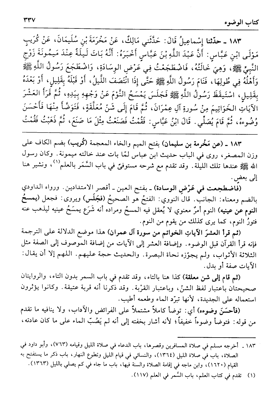 183 - (عن مَخْرمة بن سليمان) بفتح الميم والخاء المعجمة (كُريب) بضم الكاف على وزن المصغر، روى في الباب حديث ابن عباس لمّا بات عند خالته ميمونة. وكان رسول الله - صلى الله عليه وسلم - عندها تلك الليلة. وقد تقدم مع شرحه مستوفىً في باب السَّمَر بالعلم, ونشير هنا إلى بعضٍ.