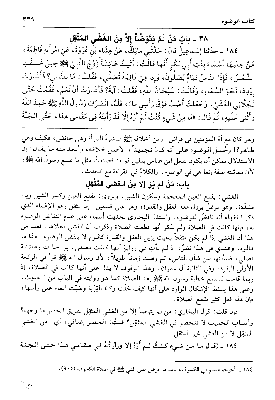 184 - حَدَّثَنَا إِسْمَاعِيلُ قَالَ حَدَّثَنِى مَالِكٌ عَنْ هِشَامِ بْنِ عُرْوَةَ عَنِ امْرَأَتِهِ فَاطِمَةَ عَنْ جَدَّتِهَا أَسْمَاءَ بِنْتِ أَبِى بَكْرٍ أَنَّهَا قَالَتْ أَتَيْتُ عَائِشَةَ زَوْجَ النَّبِيِّ - صلى الله عليه وسلم - حِينَ خَسَفَتِ الشَّمْسُ، فَإِذَا النَّاسُ قِيَامٌ يُصَلُّونَ، وَإِذَا هِىَ قَائِمَةٌ تُصَلِّى فَقُلْتُ مَا لِلنَّاسِ فَأَشَارَتْ بِيَدِهَا نَحْوَ السَّمَاءِ وَقَالَتْ سُبْحَانَ اللَّهِ. فَقُلْتُ آيَةٌ فَأَشَارَتْ أَىْ نَعَمْ. فَقُمْتُ حَتَّى تَجَلاَّنِى الْغَشْىُ، وَجَعَلْتُ أَصُبُّ فَوْقَ رَأْسِى مَاءً، فَلَمَّا انْصَرَفَ رَسُولُ اللَّهِ - صلى الله عليه وسلم - حَمِدَ اللَّهَ وَأَثْنَى عَلَيْهِ، ثُمَّ قَالَ «مَا مِنْ شَىْءٍ كُنْتُ لَمْ أَرَهُ إِلاَّ قَدْ رَأَيْتُهُ فِي مَقَامِى هَذَا حَتَّى الْجَنَّةِ