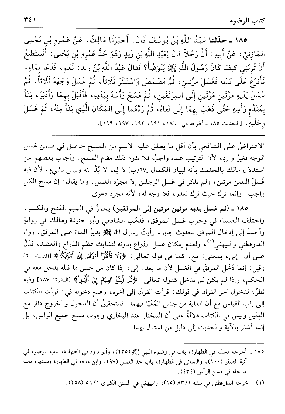185 - (ثم غسل يديه مرتين مرتين إلى المرفقين) يجوزُ في الميم الفتح والكسر. واختلف العلماء في وجوب غسل المرفق، فذَهَب الشافعي وأبو حنيفة ومالك في روايةٍ وأحمدُ إلى إدخال المرفق بحديث جابر، رأيتُ رسول الله - صلى الله عليه وسلم - يديرُ الماءَ على المرفق. رواه الدارقطني والبيهقي، ولعدم إمكان غسل الذراع بدونه لتشابك عظم الذراع والعضد، فَدَلَّ على أن: إلى، بمعنى: مع، كما في قوله تعالى: {وَلَا تَأْكُلُوا أَمْوَالَهُمْ إِلَى أَمْوَالِكُمْ} [النساء: 2] وقيل: إنما دَخَل المرفقُ في الغسل لأن ما بعد: إلى، إذا كان من جنس ما قبله يدخل معه في الحكم، وإذا لم يكن لم يدخل كقوله تعالى: {ثُمَّ أَتِمُّوا الصِّيَامَ إِلَى اللَّيْلِ} [البقرة: 187] وفيه نظرٌ؛ لدخول آخر القرآن في قولك: قرأت القرآن إلى آخره، وعدم دخوله في: قرأت الكتاب إلى باب القياس مع أن الغاية من جنس المُغَيّا فيهما. فالتحقيقُ أن الدخول والخروج دائر مع الدليل وليس في الكتاب دلالةٌ على أن المختار عند البخاري وجوب مسح جميع الرأس، بل إنما أشار بالآية والحديث إلى دليل من استدل بهما.