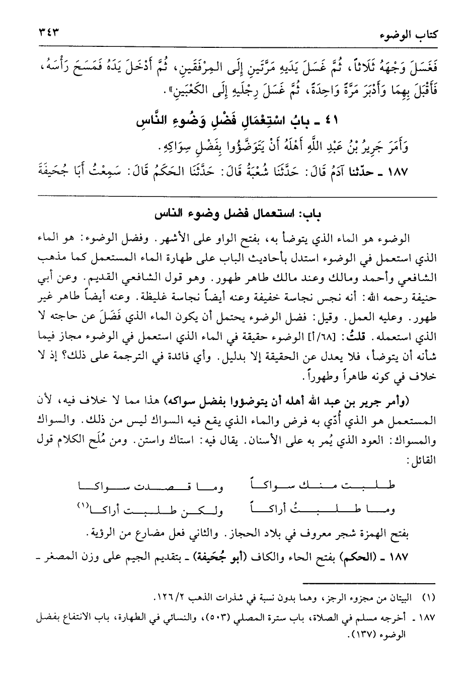 (وأمر جرير بن عبد الله أهله أن يتوضووا بفضل سواكه) هذا مما لا خلاف فيه، لأن المستعمل هو الذي أُدّي به فرض والماء الذي يقع فيه السواك ليس من ذلك. والسواك والمسواك: العود الذي يُمر به على الأسنان. يقال فيه: استاك واستن. ومن مُلَح الكلام قول القائل: