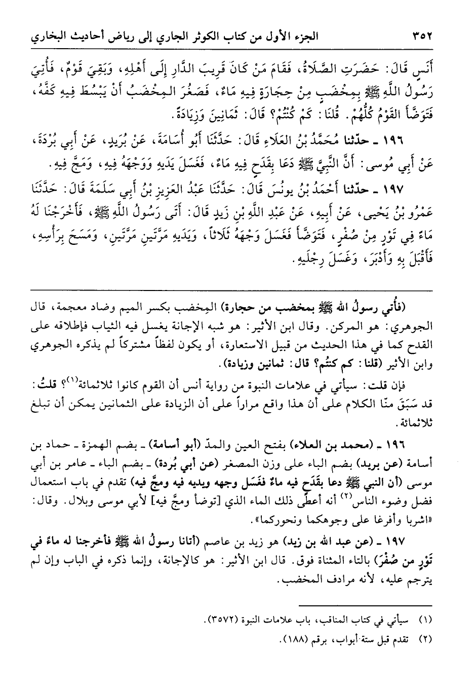 196 - (محمد بن العلاء) بفتح العين والمدُ (أبو أسامة) -بضم الهمزة- حماد بن أسامة (عن بريد) بضم الباء على وزن المصغر (عن أبي بُردة) -بضم الباء- عامر بن أبي موسى (أن النبي - صلى الله عليه وسلم - دعا بقَدَح فيه ماءٌ فغَسَل وجهه ويديه فيه ومجَّ فيه) تقدم في باب استعمال فضل وضوء الناس (2) أنه أعطى ذلك الماء الذي أتوضأ ومجَّ فيه] لأبي موسى وبلال. وقال: "اشربا وأفرغا على وجوهكما ونحوركما".