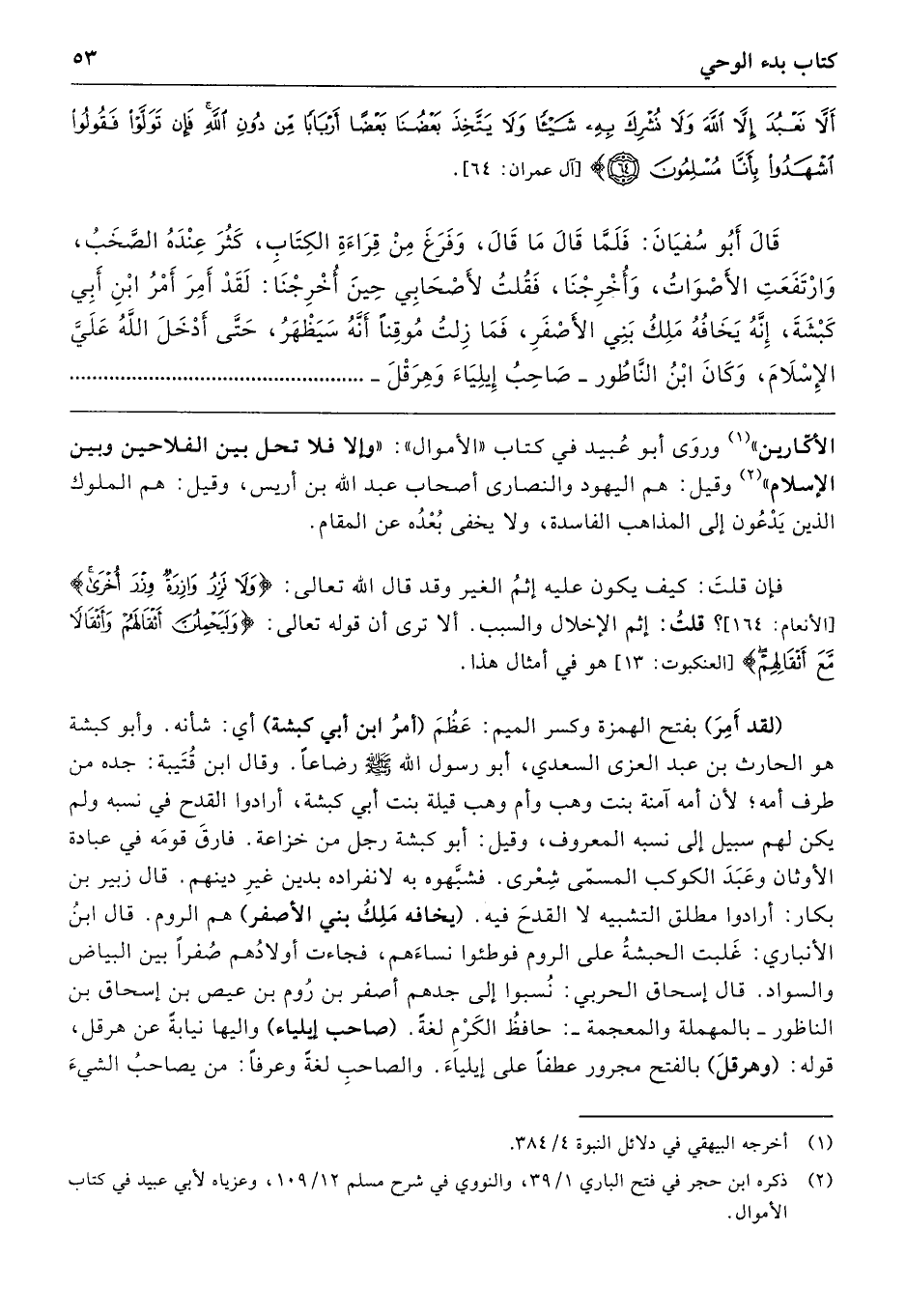 أَنْ لاَ نَعْبُدَ إِلَّا اللَّهَ وَلاَ نُشْرِكَ بِهِ شَيْئًا وَلاَ يَتَّخِذَ بَعْضُنَا بَعْضًا أَرْبَابًا مِنْ دُونِ اللَّهِ فَإِنْ تَوَلَّوْا فَقُولُوا اشْهَدُوا بِأَنَّا مُسْلِمُونَ} قَالَ أَبُو سُفْيَانَ: فَلَمَّا قَالَ مَا قَالَ، وَفَرَغَ مِنْ قِرَاءَةِ الكِتَابِ، كَثُرَ عِنْدَهُ الصَّخَبُ وَارْتَفَعَتِ الأَصْوَاتُ وَأُخْرِجْنَا، فَقُلْتُ لِأَصْحَابِي حِينَ أُخْرِجْنَا: لَقَدْ أَمِرَ أَمْرُ ابْنِ أَبِي كَبْشَةَ، إِنَّهُ يَخَافُهُ مَلِكُ بَنِي الأَصْفَرِ. فَمَا زِلْتُ مُوقِنًا أَنَّهُ سَيَظْهَرُ حَتَّى أَدْخَلَ اللَّهُ عَلَيَّ الإِسْلاَمَ. وَكَانَ ابْنُ النَّاظُورِ، صَاحِبُ إِيلِيَاءَ وَهِرَقْلَ،