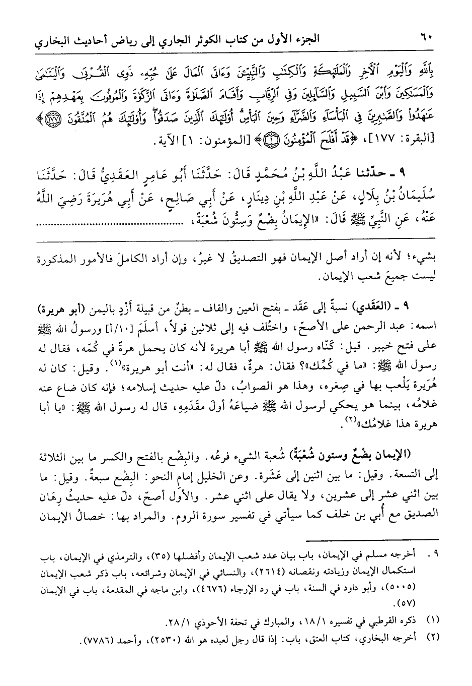 9 - حَدَّثَنَا عَبْدُ اللَّهِ بْنُ مُحَمَّدٍ الجُعْفِيُّ، قَالَ: حَدَّثَنَا أَبُو عَامِرٍ العَقَدِيُّ، قَالَ: حَدَّثَنَا سُلَيْمَانُ بْنُ بِلاَلٍ، عَنْ عَبْدِ اللَّهِ بْنِ دِينَارٍ، عَنْ أَبِي صَالِحٍ، عَنْ أَبِي هُرَيْرَةَ رَضِيَ اللَّهُ عَنْهُ، عَنِ النَّبِيِّ صَلَّى اللهُ عَلَيْهِ وَسَلَّمَ قَالَ «الإِيمَانُ بِضْعٌ وَسِتُّونَ شُعْبَةً،