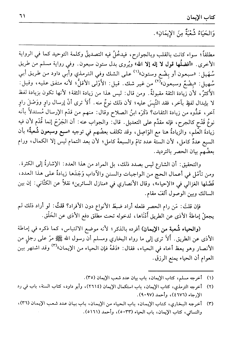 مطلقًا؛ سواء كانت بالقلب وبالجوارح، فيدخُلُ فيه التصديقُ وكلمة التوحيد كما في الرواية الأخرى. "أفضلُها قول لا إله إلا الله" ويُروى بدل ستون سبعون. وفي رواية مسلم من طريق سُهَيل: "سبعون أو بِضْع وستون" على الشك وفي الترمذي وأبي داود من طريق أبي سُهيل: "بِضْعٌ وسبعون" من غير شك. قيل: الأَوْلى الأقلُّ؛ لأنه متفق عليه، وقيل: الأَكثرُ، لأن زيادة الثقة مقبولةٌ. ومن قال: ليس هذا من زيادة الثقة؛ لأنها تكون بزيادة لفظ لا بإبدال لفظٍ بآخر، فقد التُبِسَ عليه؛ لأن ذلك نوعٌ منه. أَلاَ ترى أنّ إرسال راوٍ ووَصْلَ راوٍ آخر، عَدُّوه من زيادة الثقات؟ ذكَرَه ابنُ الصلاح وقال: منهم من قدّم الإرسال مُستدلًا بأنه نوعُ قَدْحٍ كالجرح، فإنه مقدَّم على التعديل. قال: والجواب عنه: أن الجَرْحَ إنما قُدّم لأن فيه زيادةَ العلم، والزيادةُ هنا مع الوَاصِل، وقد تكلف بعضُهم في توجيه "سبع وسبعون شُعبةً" بأن السبع عددٌ كامل، لأن الستة عدد تامّ والسبعةَ كامل؛ لأن بعد التمام ليس إلا الكمال، ورام بعضُهم بيان الحصر بالترديد.
