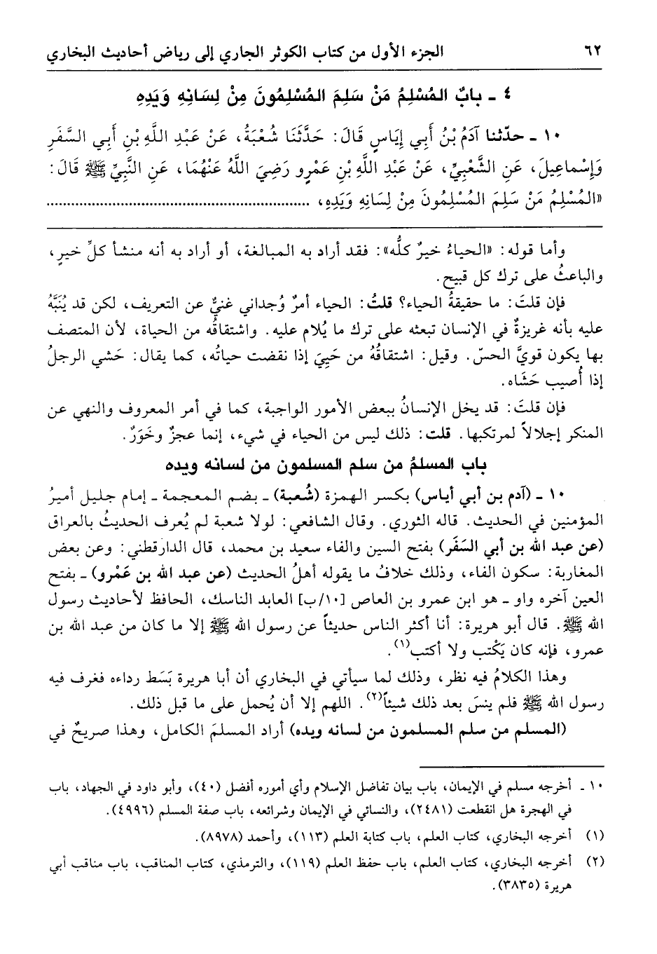 10 - حَدَّثَنَا آدَمُ بْنُ أَبِي إِيَاسٍ، قَالَ: حَدَّثَنَا شُعْبَةُ، عَنْ عَبْدِ اللَّهِ بْنِ أَبِي السَّفَرِ، وَإِسْمَاعِيلَ بْنِ أَبِي خَالِدٍ، عَنِ الشَّعْبِيِّ، عَنْ عَبْدِ اللَّهِ بْنِ عَمْرٍو رَضِيَ اللَّهُ عَنْهُمَا، عَنِ النَّبِيِّ صَلَّى اللهُ عَلَيْهِ وَسَلَّمَ قَالَ: «المُسْلِمُ مَنْ سَلِمَ المُسْلِمُونَ مِنْ لِسَانِهِ وَيَدِهِ،