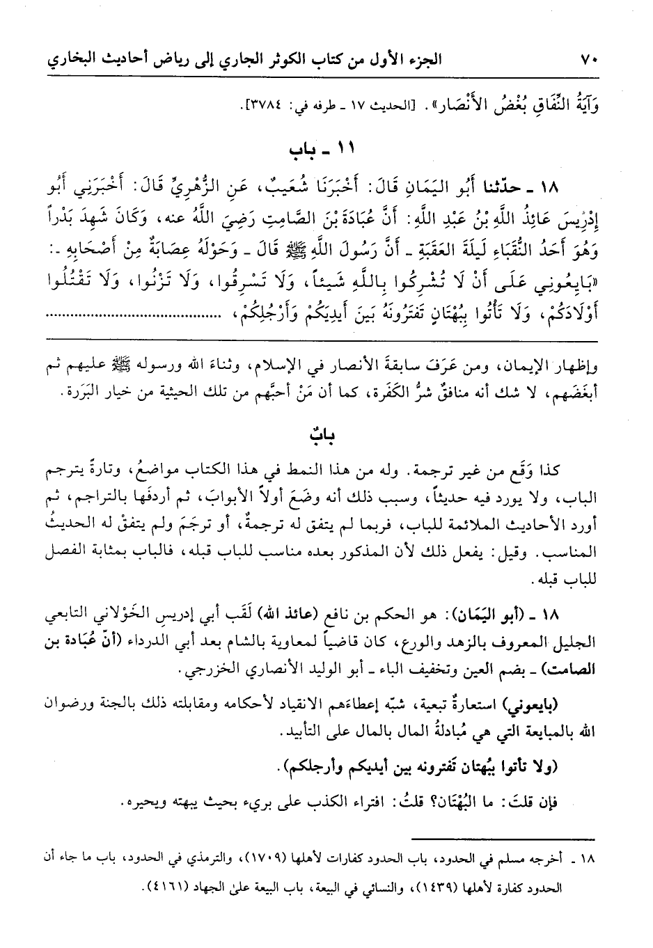 18 - حَدَّثَنَا أَبُو اليَمَانِ، قَالَ: أَخْبَرَنَا شُعَيْبٌ، عَنِ الزُّهْرِيِّ، قَالَ: أَخْبَرَنِي أَبُو إِدْرِيسَ عَائِذُ اللَّهِ بْنُ عَبْدِ اللَّهِ، أَنَّ عُبَادَةَ بْنَ الصَّامِتِ رَضِيَ اللَّهُ عَنْهُ وَكَانَ شَهِدَ بَدْرًا وَهُوَ أَحَدُ النُّقَبَاءِ لَيْلَةَ العَقَبَةِ: أَنَّ رَسُولَ اللَّهِ صَلَّى اللهُ عَلَيْهِ وَسَلَّمَ قَالَ، وَحَوْلَهُ عِصَابَةٌ مِنْ أَصْحَابِهِ: «بَايِعُونِي عَلَى أَنْ لاَ تُشْرِكُوا بِاللَّهِ شَيْئًا، وَلاَ تَسْرِقُوا، وَلاَ تَزْنُوا، وَلاَ تَقْتُلُوا أَوْلاَدَكُمْ، وَلاَ تَأْتُوا بِبُهْتَانٍ تَفْتَرُونَهُ بَيْنَ أَيْدِيكُمْ وَأَرْجُلِكُمْ،