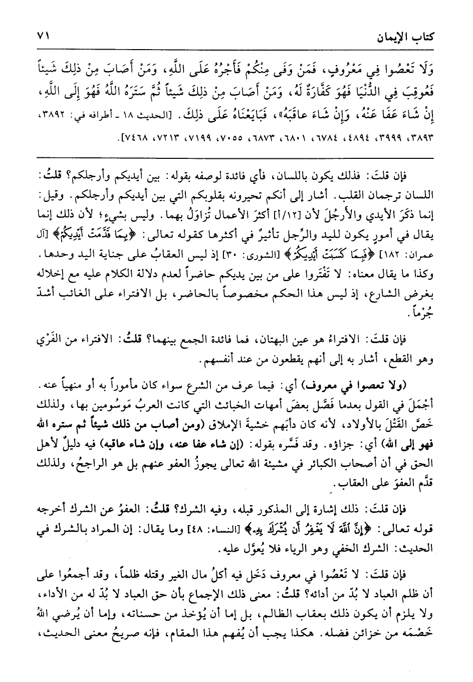 (ولا تعصوا في معروف) أي: فيما عرف من الشرع سواء كان مأمورًا به أو منهيًا عنه. أجْمَلَ في القول بعدما فَضَل بعضَ أمهات الخبائث التي كانت العربُ مَوسُومين بها، ولذلك خَصَّ القَتْلَ بالأولاد، لأنه كان دأبَهم خشيةَ الإملاق (ومن أصاب من ذلك شيئًا ثم ستره الله فهو إلى الله) أي: جزاؤه. وقد فَسَّره بقوله: (إن شاء عفا عنه، وإن شاء عاقبه) فيه دليلٌ لأهل الحق في أن أصحاب الكبائر في مشيئة الله تعالى يجوزُ العفو عنهم بل هو الراجحُ، ولذلك قدِّم العفوَ على العقاب.