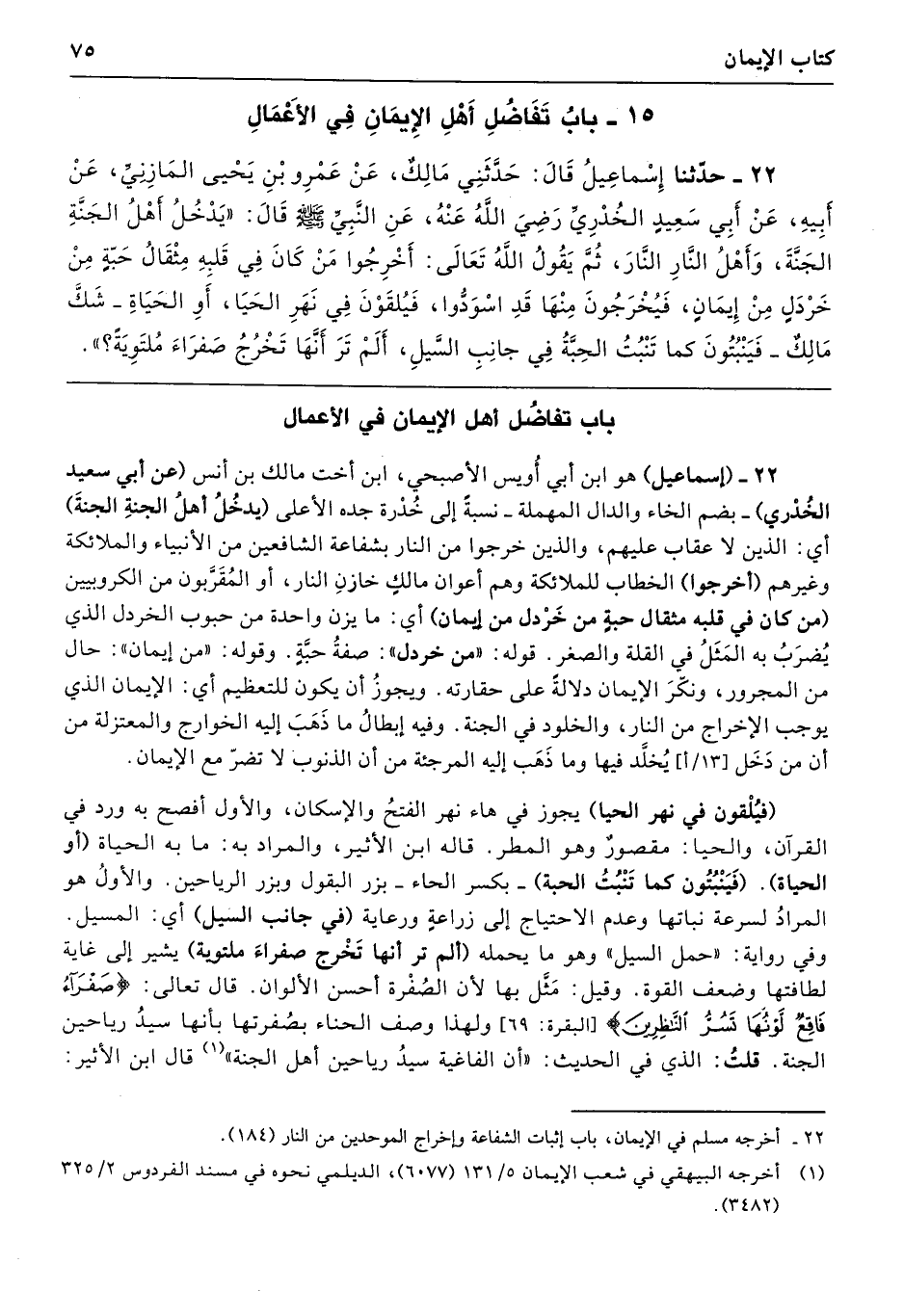 22 - (إسماعيل) هو ابن أبي أُويس الأصبحي، ابن أخت مالك بن أنس (عن أبي سعيد الخُدْري) -بضم الخاء والدال المهملة- نسبةً إلى خُدْرة جده الأعلى (يدخُلُ أهلُ الجنةِ الجنةَ) أي: الذين لا عقاب عليهم، والذين خرجوا من النار بشفاعة الشافعين من الأنبياء والملائكة وغيرهم (أخرجوا) الخطاب للملائكة وهم أعوان مالكٍ خازنِ النار، أو المُقَرَّبون من الكروبيين (من كان في قلبه مثقال حبةٍ من خَرْدل من إيمان) أي: ما يزن واحدة من حبوب الخردل الذي يُضرَبُ به المَثَلُ في القلة والصغر. قوله: "من خردل": صفةُ حبَّةٍ. وقوله: "من إيمان": حال من المجرور، ونكرَ الإيمان دلالةً على حقارته. ويجوزُ أن يكون للتعظيم أي: الإيمان الذي يوجب الإخراج من النار، والخلود في الجنة. وفيه إبطالُ ما ذَهَبَ إليه الخوارج والمعتزلة من أن من دَخَل يُخلَّد فيها وما ذَهَب إليه المرجئة من أن الذنوب لا تضرّ مع الإيمان.