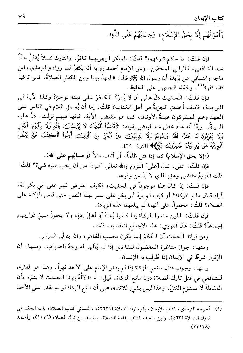 فإن قلتَ: إذا كان هذا موجودًا في الحديث، فكيف اعترض عُمر على أبي بكر لمّا أراد قتال مانع الزكاة؟ أو كيف لم يردّ أبو بكر على عمر بهذا النص حتى قاس الزكاة على الصلاة؟ قلتُ: محمولٌ على أنهما لم يبلغهما هذه الزيادة.