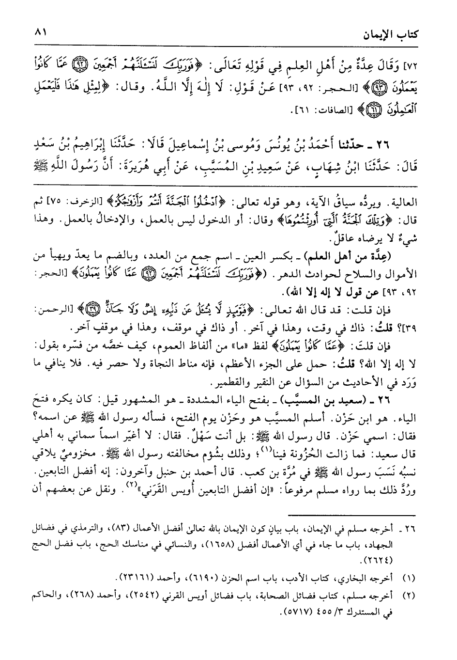(عِدَّة من أهل العلم) -بكسر العين- اسم جمع من العدد، وبالضم ما يعدّ ويهيأ من الأموال والسلاح لحوادث الدهر. {فَوَرَبِّكَ لَنَسْأَلَنَّهُمْ أَجْمَعِينَ (92) عَمَّا كَانُوا يَعْمَلُونَ} [الحجر: 92، 93] عن قول لا إله إلا الله).