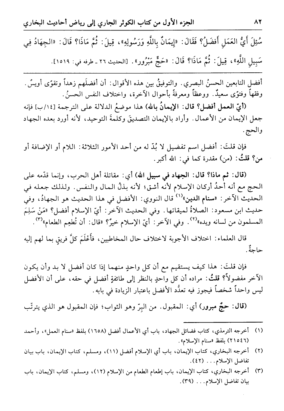 سُئِلَ: أَيُّ العَمَلِ أَفْضَلُ؟ فَقَالَ: «إِيمَانٌ بِاللَّهِ وَرَسُولِهِ». قِيلَ: ثُمَّ مَاذَا؟ قَالَ: «الجِهَادُ فِي سَبِيلِ اللَّهِ» قِيلَ: ثُمَّ مَاذَا؟ قَالَ: «حَجٌّ مَبْرُورٌ». [الحديث 26 - طرفه في: 1519].