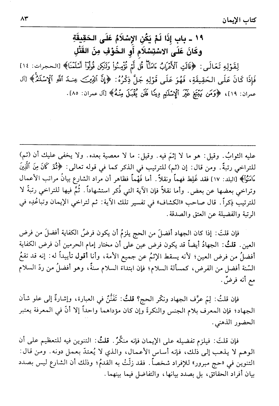 لِقَوْلِهِ تَعَالَى: {قَالَتِ الأَعْرَابُ آمَنَّا قُلْ لَمْ تُؤْمِنُوا وَلَكِنْ قُولُوا أَسْلَمْنَا} [الحجرات: 14] فَإِذَا كَانَ عَلَى الحَقِيقَةِ، فَهُوَ عَلَى قَوْلِهِ جَلَّ ذِكْرُهُ: {إِنَّ الدِّينَ عِنْدَ اللَّهِ الإِسْلاَمُ} [آل عمران: 19] [وَمَنْ يَبْتَغِ غَيْرَ الْإِسْلَامِ دِينًا فَلَنْ يُقْبَلَ مِنْهُ].