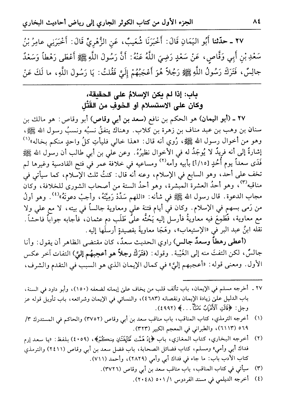 27 - حَدَّثَنَا أَبُو اليَمَانِ، قَالَ: أَخْبَرَنَا شُعَيْبٌ، عَنِ الزُّهْرِيِّ، قَالَ: أَخْبَرَنِي عَامِرُ بْنُ سَعْدِ بْنِ أَبِي وَقَّاصٍ، عَنْ سَعْدٍ رَضِيَ اللَّهُ عَنْهُ، أَنَّ رَسُولَ اللَّهِ صَلَّى اللهُ عَلَيْهِ وَسَلَّمَ أَعْطَى رَهْطًا وَسَعْدٌ جَالِسٌ، فَتَرَكَ رَسُولُ اللَّهِ صَلَّى اللهُ عَلَيْهِ وَسَلَّمَ رَجُلًا هُوَ أَعْجَبُهُمْ إِلَيَّ، فَقُلْتُ: يَا رَسُولَ اللَّهِ مَا لَكَ عَنْ