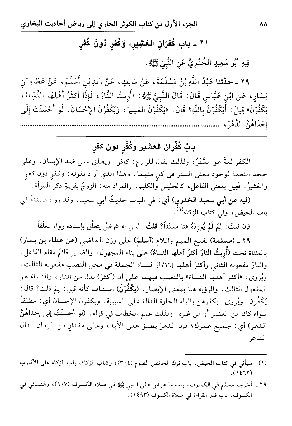 الكفر لغةً هو السَّتْرُ، ولذلك يقال للزارع: كافر. ويطلق على ضد الإيمان، وعلى جحد النعمة لوجود معنى الستر في كلٍ منهما. وهذا الذي أراد بقوله: وكفرٍ دون كفرٍ. والعَشيرُ: فَعِيل بمعنى الفاعل، كالجليس والكليم. والمراد منه: الزوجُ بقرينةِ ذكر المرأة.