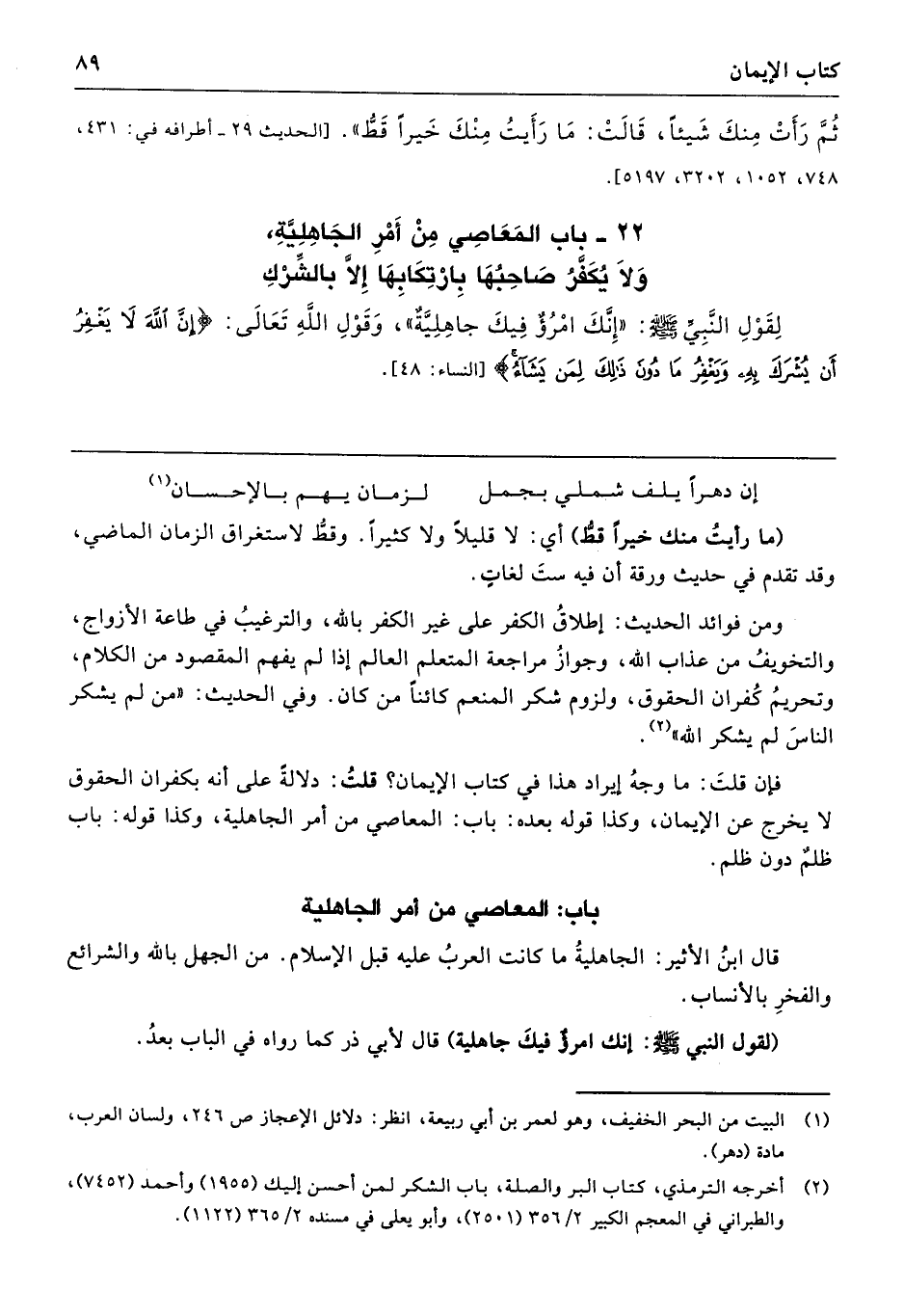 لِقَوْلِ النَّبِيِّ صَلَّى اللهُ عَلَيْهِ وَسَلَّمَ: «إِنَّكَ امْرُؤٌ فِيكَ جَاهِلِيَّةٌ» وَقَوْلِ اللَّهِ تَعَالَى: {إِنَّ اللَّهَ لاَ يَغْفِرُ أَنْ يُشْرَكَ بِهِ وَيَغْفِرُ مَا دُونَ ذَلِكَ لِمَنْ يَشَاءُ} [النساء: 48].
