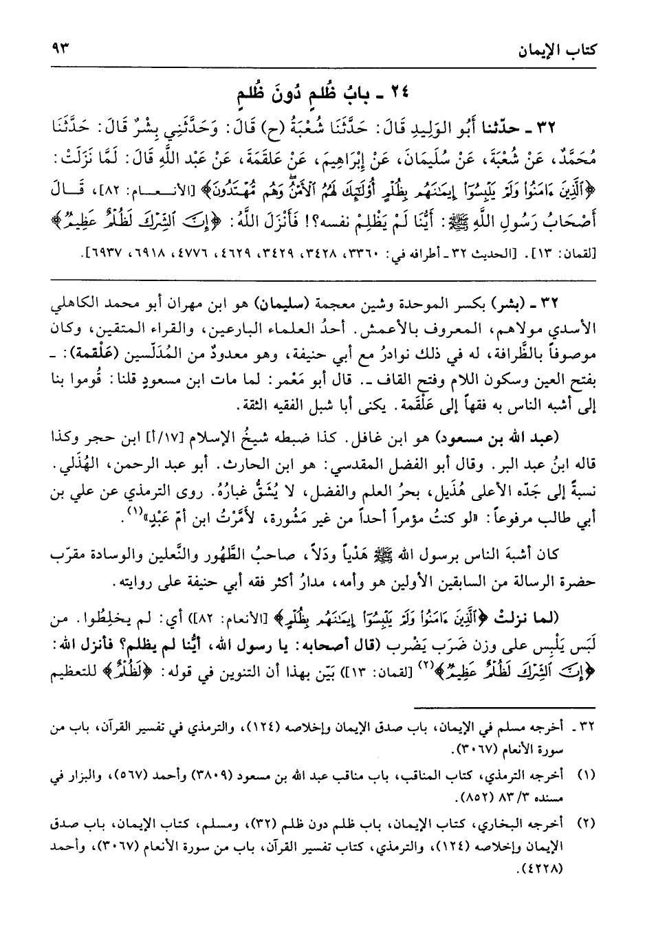 32 - (بشر) بكسر الموحدة وشين معجمة (سليمان) هو ابن مهران أبو محمد الكاهلي الأسدي مولاهم، المعروف بالأعمش. أحدُ العلماء البارعين، والقراء المتقين، وكان موصوفًا بالظّرافة، له في ذلك نوادرُ مع أبي حنيفة، وهو معدودٌ من المُدَلّسين (عَلْقمة): -بفتح العين وسكون اللام وفتح القاف-. قال أبو مَعْمر: لما مات ابن مسعودٍ قلنا: قُوموا بنا إلى أشبه الناس به فقهًا إلى عَلْقَمة. يكنى أبا شبل الفقيه الثقة.