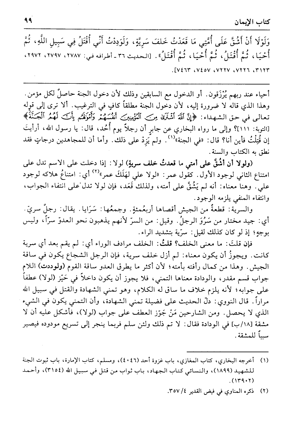 فإن قلتَ: ما معنى الخلف؟ قلتُ: الخلف مرادف الوراء أي: لم يقم بعد أي سرية كانت. ويجوزُ أن يكون معناه: لم أزل خلف سرية، فإن الرجل الشجاع يكون في ساقة الجيش. وهذا من كمال رأفته بأمته؛ لأن أكثر ما يطرق العدو ساقة القوم (ولوددت) اللام جواب قسم مقدر، والودادة معناها التمني، فلا يجوز أن يكون داخلًا في حَيّز (لولا) عطفًا على جوابه؛ لأنه يلزم خلاف ما ساق له الكلام، وهو تمني الشهادة والقتل في سبيل الله مرارًا. قال النووي: دلّ الحديث على فضيلة تمني الشهادة، وأن التمني يكون في الشيء الذي لا يحصل. ومن الشارحين مَنْ جَوَّز العطف على جواب (لولا)، فأشكل عليه أن لا مشقة في الودادة فقال: لا تم ذلك ولئن سلم فربما ينجر إلى تسريع مودوده فيصير سببًا للمشقة.