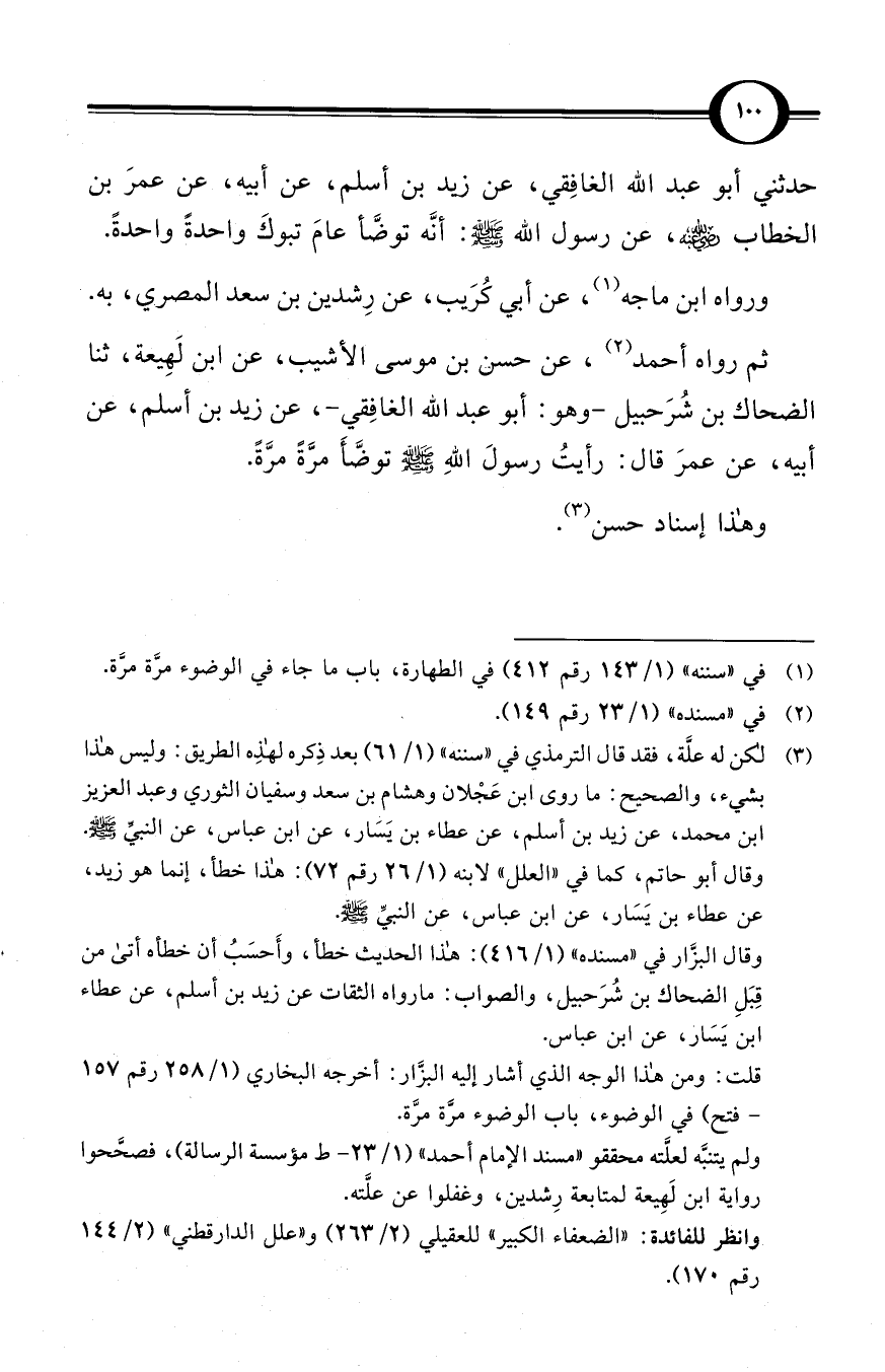 حدثني أبو عبد الله الغافِقي، عن زيد بن أسلم، عن أبيه، عن عمرَ بن الخطاب -رضي الله عنه-، عن رسول الله صلى الله عليه وسلم: أنَّه توضَّأ عامَ تبوكَ واحدةً واحدةً.