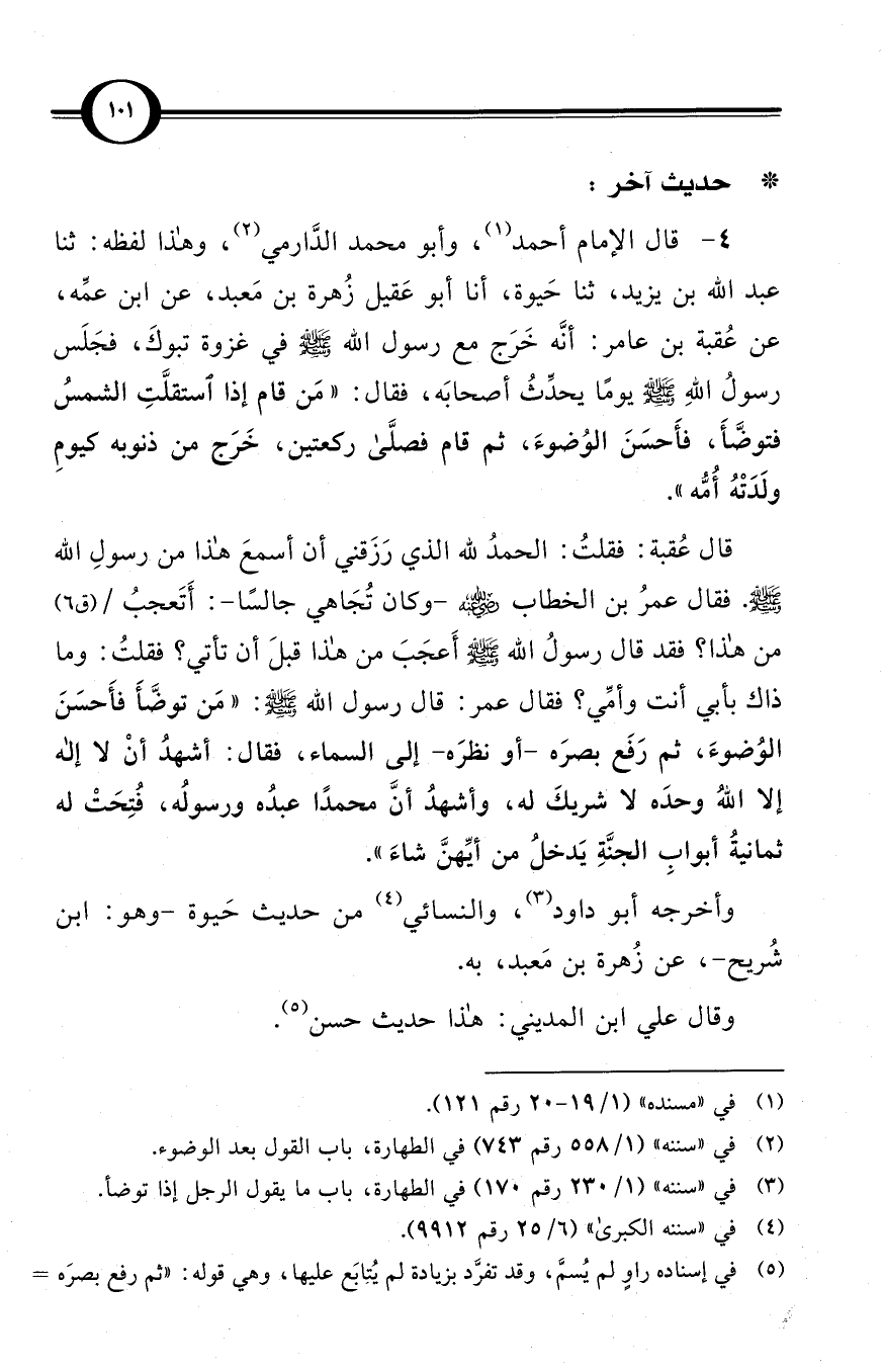 (4) قال الإمام أحمد (¬1)، وأبو محمد الدَّارمي (¬2)، وهذا لفظه: ثنا عبد الله بن يزيد، ثنا حَيوة، أنا أبو عَقيل زُهرة بن مَعبد، عن ابن عمِّه، عن عُقبة بن عامر: أنَّه خَرَج مع رسول الله صلى الله عليه وسلم في غزوة تبوكَ، فجَلَس رسولُ اللهِ صلى الله عليه وسلم يومًا يحدِّثُ أصحابَه، فقال: «مَن قام إذا استقلَّتِ الشمسُ فتوضَّأَ، فأَحسَنَ الوُضوءَ، ثم قام فصلَّى ركعتين، خَرَج من ذنوبه كيومِ ولَدَتْهُ أُمُّه».