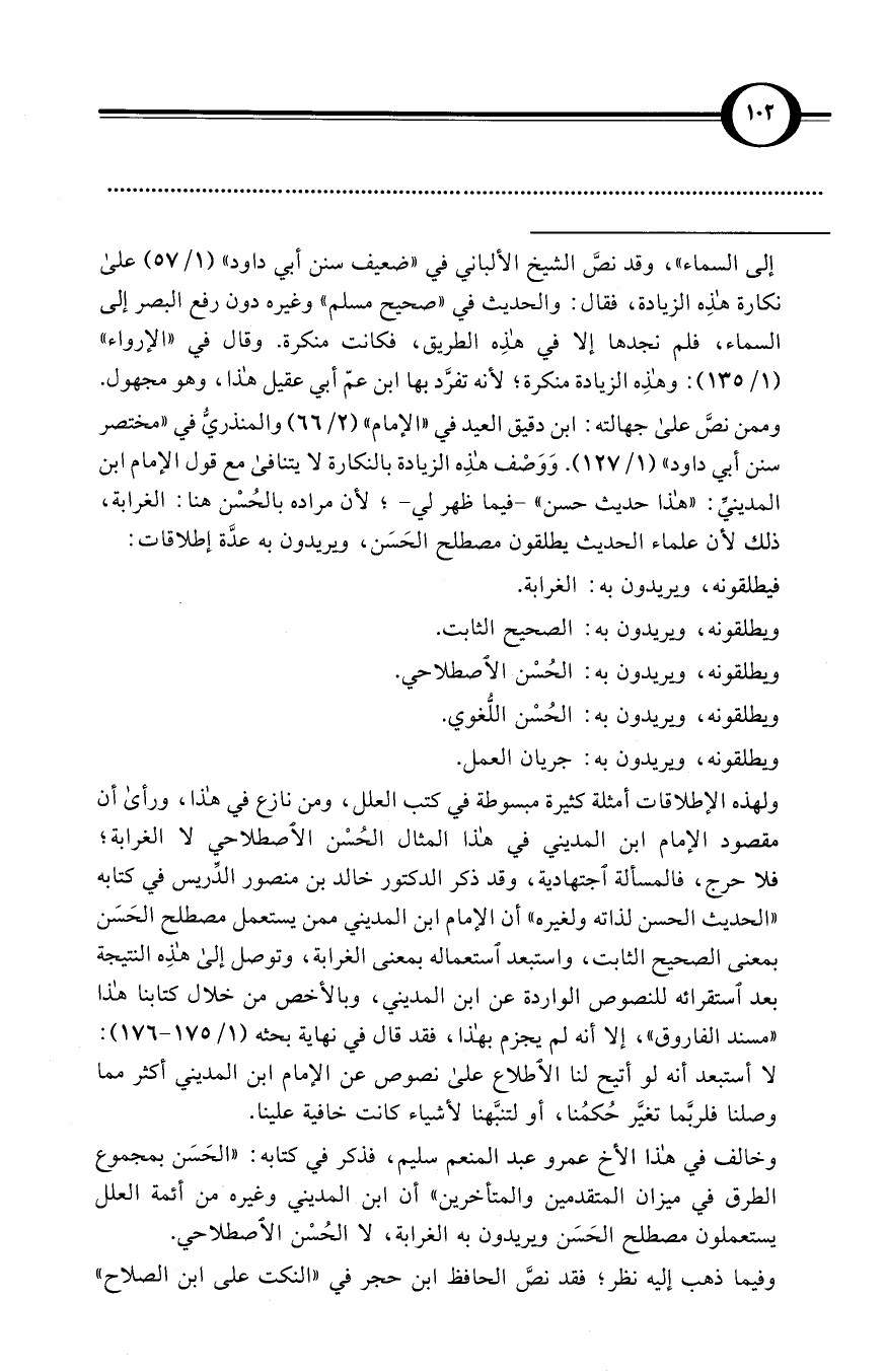 وخالف في هذا الشيخ عمرو عبد المنعم سليم، فذكر في كتابه: «الحَسَن بمجموع الطرق في ميزان المتقدمين والمتأخرين» أن ابن المديني وغيره من أئمة العلل يستعملون مصطلح الحَسَن ويريدون به الغرابة، لا الحُسْن الاصطلاحي.