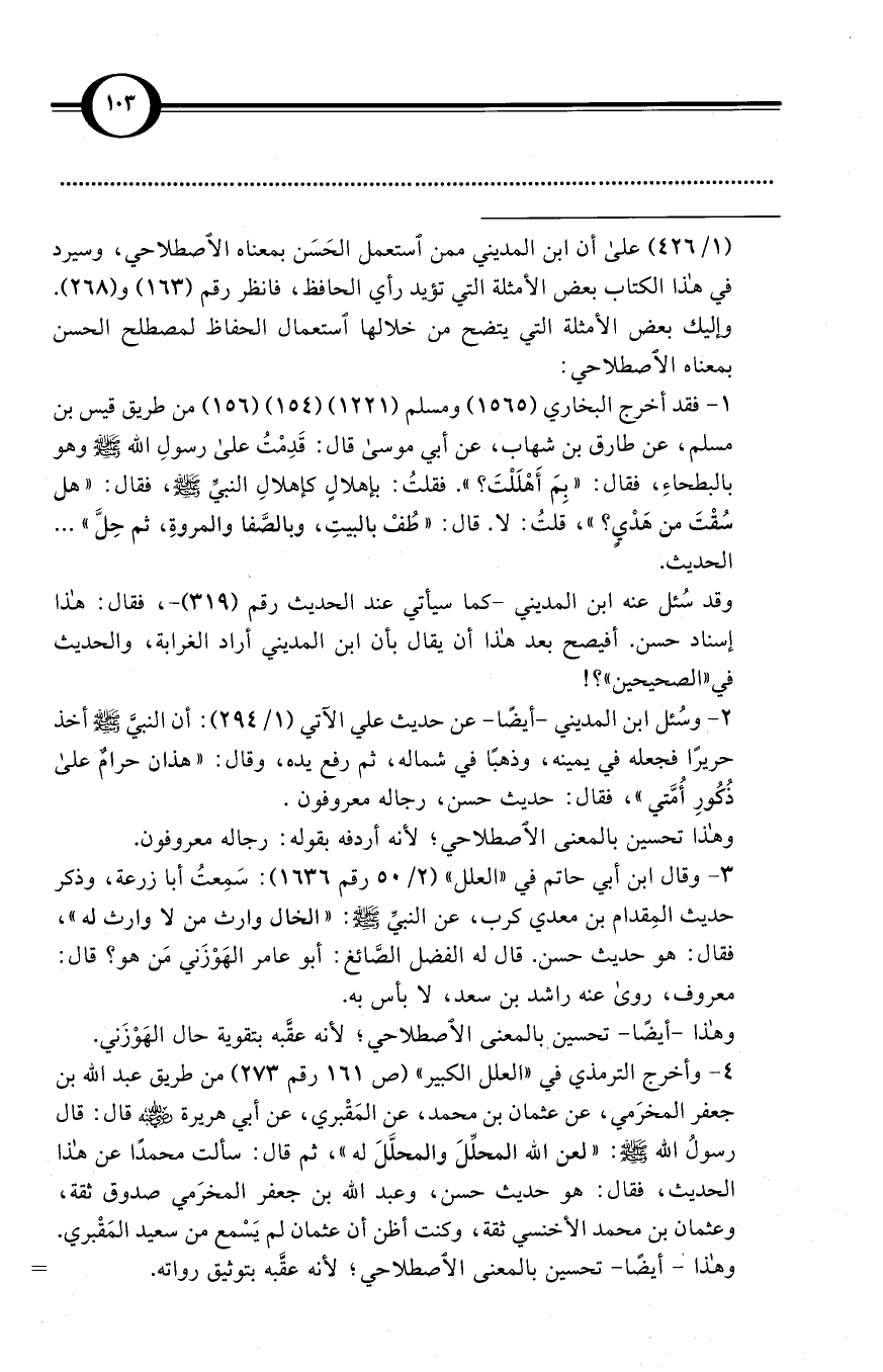 = (1/ 426) على أن ابن المديني ممن استعمل الحَسَن بمعناه الاصطلاحي، وسيرد في هذا الكتاب بعض الأمثلة التي تؤيد رأي الحافظ، فانظر رقم (163) و (268).