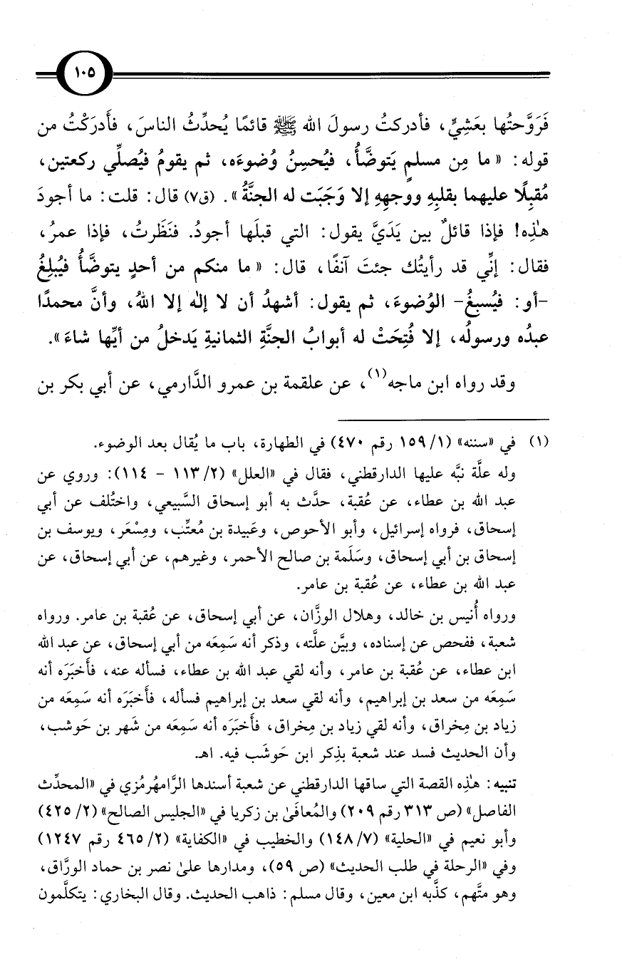 فَرَوَّحتُها بعَشِيٍّ، فأدركتُ رسولَ الله صلى الله عليه وسلم قائمًا يُحدِّثُ الناسَ، فأَدرَكْتُ من قوله: «ما مِن مسلمٍ يَتوضَّأُ، فيُحسِنُ وُضوءَه، ثم يقومُ فيُصلِّي ركعتين، مُقبِلاً عليهما بقلبِهِ ووجهِهِ إلا وَجَبَت له الجنَّةُ)). / (ق 7) قال: قلت: ما أجودَ هذه! فإذا قائلٌ بين يَدَيَّ يقول: التي قبلَها أجودُ. فنَظَرتُ، فإذا عمرُ، فقال: إنِّي قد رأيتُك جئتَ آنفًا، قال: «ما منكم من أحدٍ يتوضَّأُ فيُبلِغُ -أو: فيُسبِغُ- الوُضوءَ، ثم يقول: أشهدُ أن لا إلهَ إلا اللهُ، وأنَّ محمدًا عبدُه ورسولُه، إلا فُتِحَتْ له أبوابُ الجنَّةِ الثمانيةِ يَدخلُ من أيِّها شاءَ».
