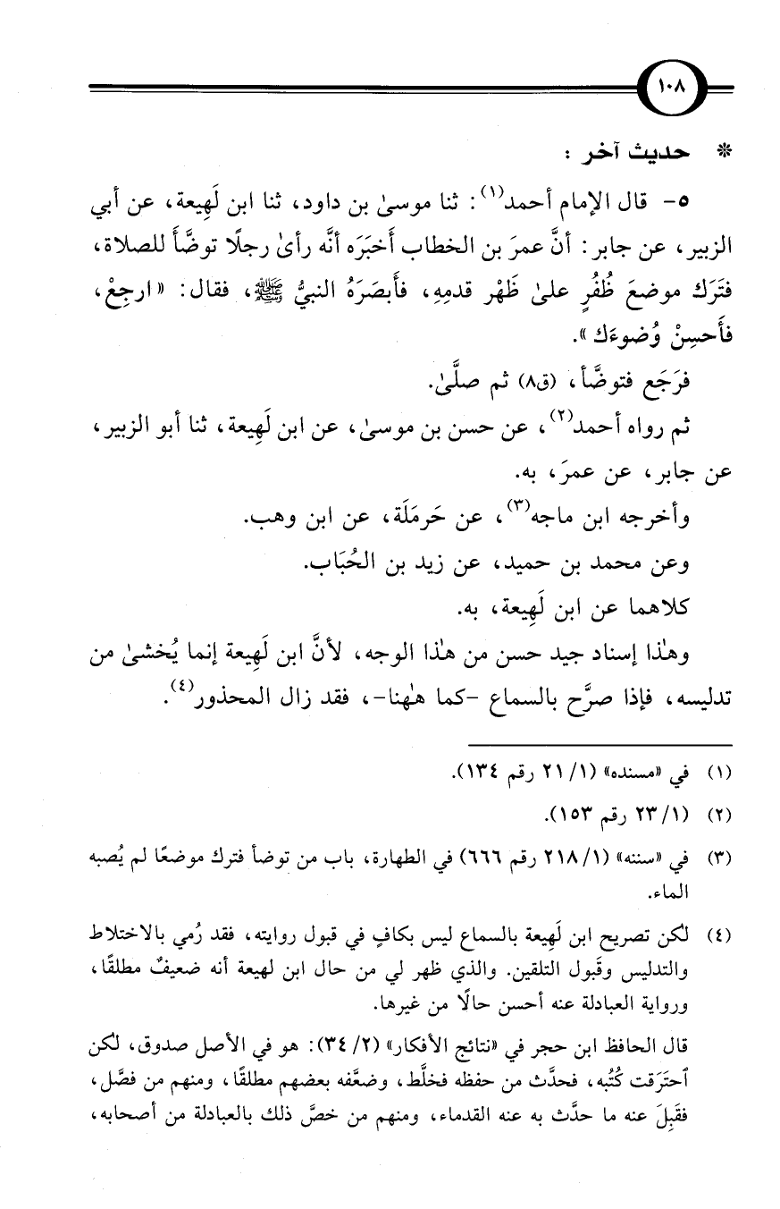 (5) قال الإمام أحمد (¬1): ثنا موسى بن داود، ثنا ابن لَهِيعة، عن أبي الزبير، عن جابر: أنَّ عمرَ بن الخطاب أَخبَرَه أنَّه رأى رجلاً توضَّأَ للصلاة، فتَرَك موضعَ ظُفْرٍ على ظَهْر قدمِهِ، فأَبصَرَهُ النبيُّ صلى الله عليه وسلم، فقال: «ارجِعْ، فأَحسِنْ وُضوءَك».