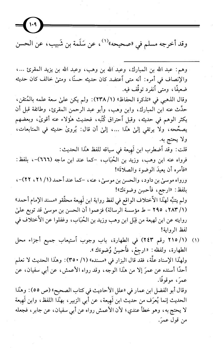(¬1) (1/ 215 رقم 243) في الطهارة، باب وجوب استيعاب جميع أجزاء محل الطهارة، ولفظه: «ارجِعْ، فأَحسِنْ وُضوءَك».