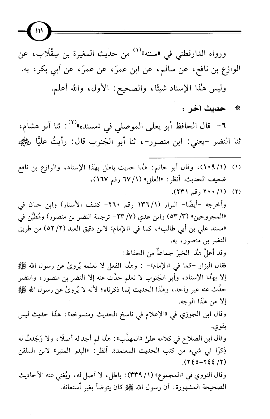 فقال البزار -كما في «الإمام» -: وهذا الفعل لا نعلمه يُروى عن رسول الله صلى الله عليه وسلم إلا بهذا الإسناد، وأبو الجَنوب لا نعلم حدَّث عنه إلا النضر بن منصور، والنضر حدَّث عنه غير واحد، وهذا الحديث إنما ذكرناه؛ لأنه لا يُروى عن رسول الله صلى الله عليه وسلم إلا من هذا الوجه.