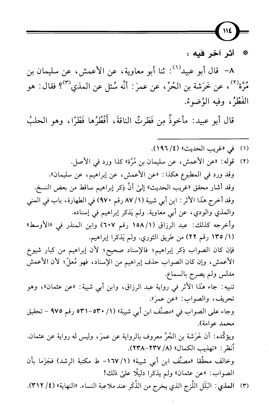 (8) قال أبو عبيد (¬1): ثنا أبو معاوية، عن الأعمش، عن سليمان بن مُرَّة (¬2)،