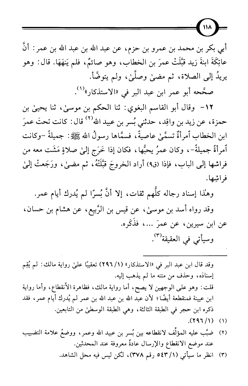 أبي بكر بن محمد بن عمرو بن حزم، عن عبد الله بن عبد الله بن عمر: أنَّ عاتِكَةَ ابنةَ زيد قبَّلَتْ عمرَ بن الخطاب، وهو صائمٌ، فلم يَنهَهَا. قال: وهو يريدُ إلى الصلاة، ثم مضى وصلَّى، ولم يتوضَّأ.