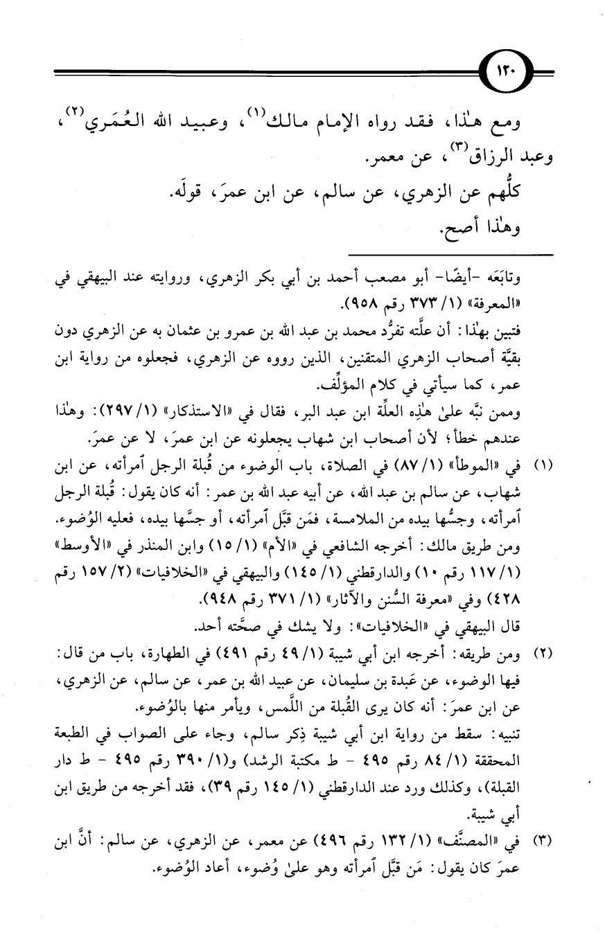 (¬2) ومن طريقه: أخرجه ابن أبي شيبة (1/ 49 رقم 491) في الطهارة، باب من قال: فيها الوضوء، عن عَبدة بن سليمان، عن عبيد الله بن عمر، عن سالم، عن الزهري، عن ابن عمرَ: أنه كان يرى القُبلة من اللَّمس، ويأمر منها بالوُضوء.