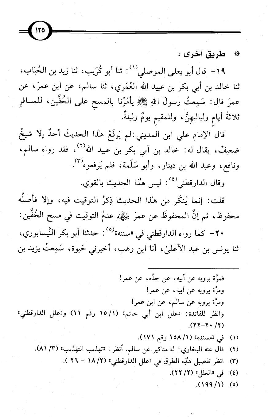 (19) قال أبو يعلى الموصلي (¬1): ثنا أبو كُرَيب، ثنا زيد بن الحُبَاب، ثنا خالد بن أبي بكر بن عبيد الله العُمَري، ثنا سالم، عن ابن عمرَ، عن عمرَ قال: سَمِعتُ رسولَ اللهِ صلى الله عليه وسلم يأمُرُنا بالمسحِ على الخُفَّين، للمسافرِ ثلاثةُ أيامٍ ولياليهِنَّ، وللمقيمِ يومٌ وليلةٌ.