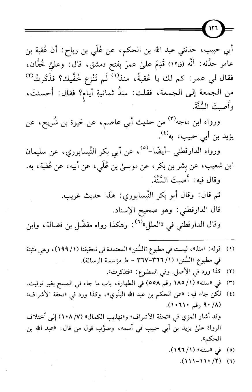 أبي حبيب، حدثني عبد الله بن الحكم، عن عُلَي بن رباح: أن عُقبة بن عامر حدَّثه: أنَّه / (ق 12) قَدِمَ على عمرَ بفتح دمشق، قال: وعليَّ خُفَّان، فقال لي عمر: كم لك يا عُقبةُ، منذ (¬1) لَم تَنْزع خُفَّيك؟ فذَكَرتُ (¬2) من الجمعة إلى الجمعة، فقلت: منذُ ثمانيةِ أيامٍ؟ فقال: أَحسنتَ، وأَصبتَ السُّنَّةَ.