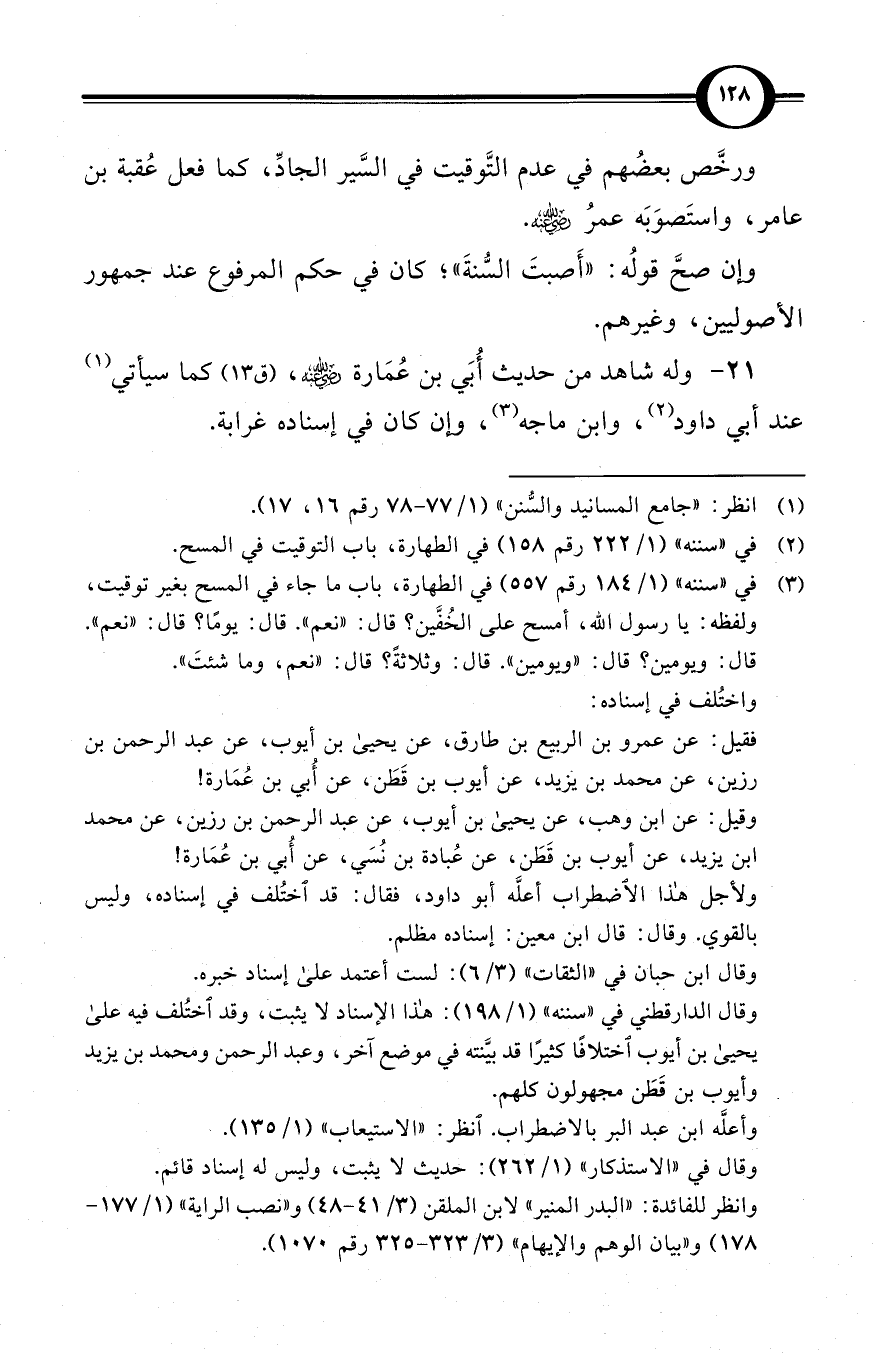 (¬3) في «سننه» (1/ 184 رقم 557) في الطهارة، باب ما جاء في المسح بغير توقيت، ولفظه: يا رسول الله، أمسح على الخُفَّين؟ قال: «نعم». قال: يومًا؟ قال: «نعم». قال: ويومين؟ قال: «ويومين». قال: وثلاثةً؟ قال: «نعم، وما شئتَ».