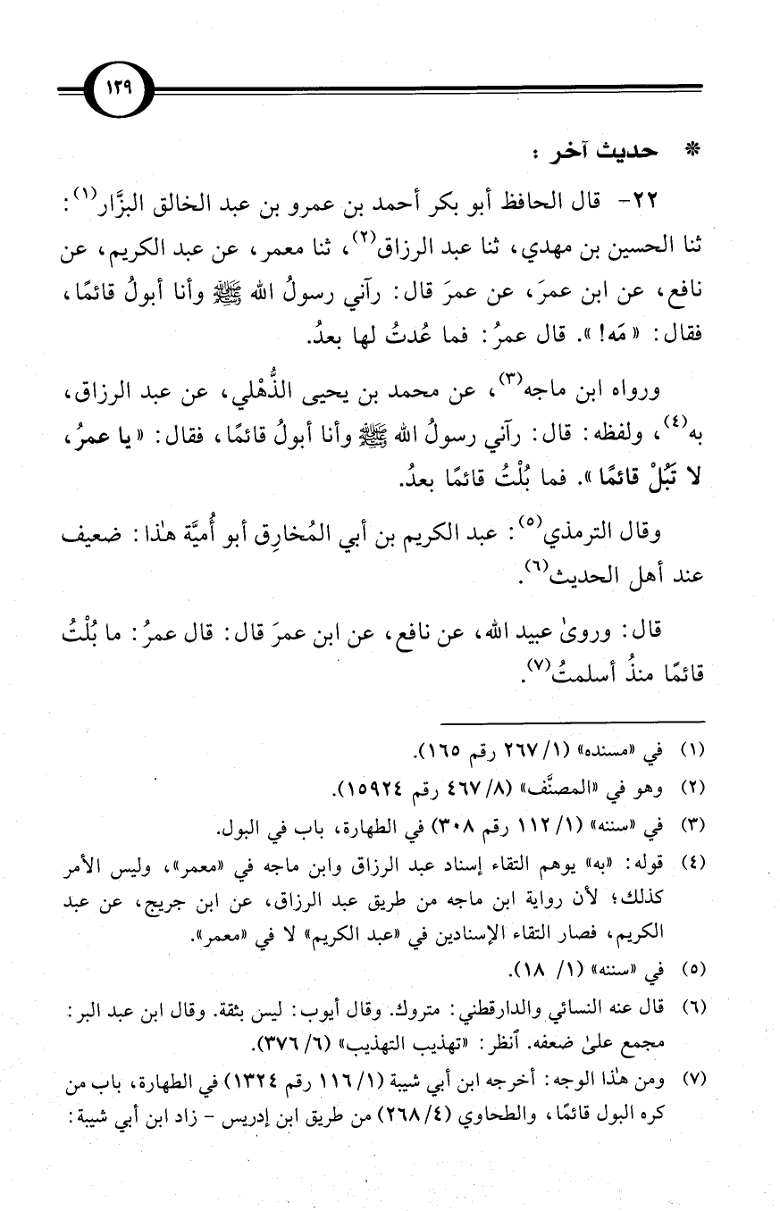 (22) قال الحافظ أبو بكر أحمد بن عمرو بن عبد الخالق البزَّار (¬1): ثنا الحسين بن مهدي، ثنا عبد الرزاق (¬2)، ثنا معمر، عن عبد الكريم، عن نافع، عن ابن عمرَ، عن عمرَ قال: رآني رسولُ الله صلى الله عليه وسلم وأنا أبولُ قائمًا، فقال: «مَه!» . قال عمرُ: فما عُدتُ لها بعدُ.