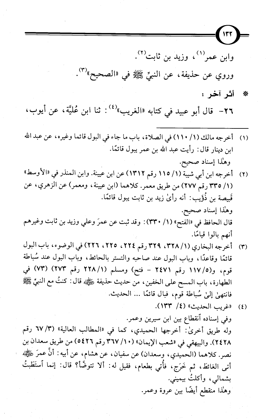 (¬2) أخرجه ابن أبي شيبة (1/ 115 رقم 1312) عن ابن عيينة. وابن المنذر في «الأوسط» (1/ 335 رقم 277) من طريق معمر. كلاهما (ابن عيينة، ومعمر) عن الزهري، عن قَبيصة بن ذُؤَيب: أنه رأى زيد بن ثابت يبول قائمًا.