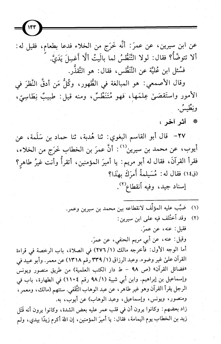 عن ابن سيرين، عن عمرَ: أنَّه خَرَج من الخلاء فدعا بطعامٍ، فقيل له: ألا تتوضَّأُ؟ فقال: لولا التَّنَطُّسُ لما بالَيتُ ألا أَغسِلَ يَدَيَّ.