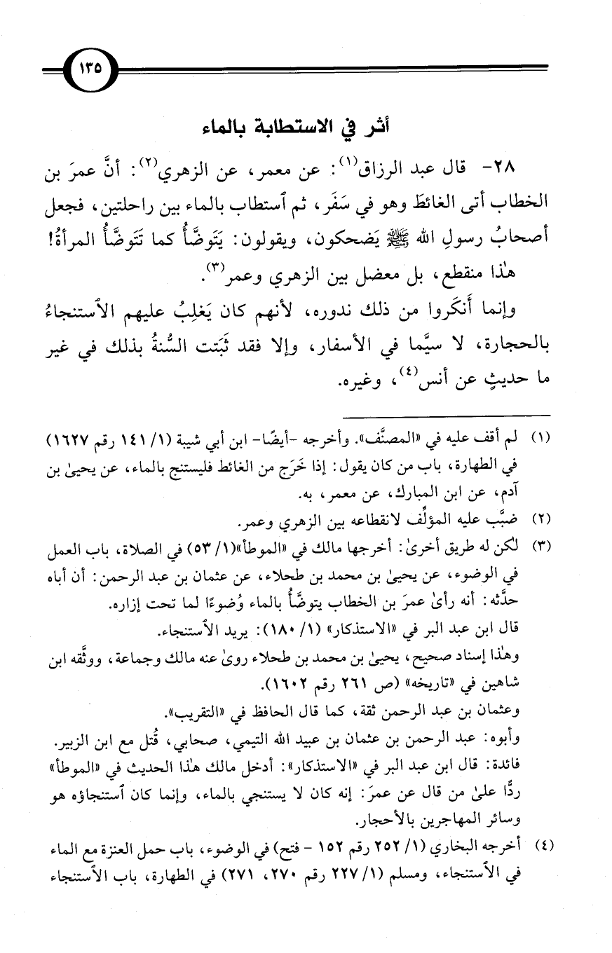 (28) قال عبد الرزاق (¬1): عن معمر، عن الزهري (¬2): أنَّ عمرَ بن الخطاب أتى الغائطَ وهو في سَفَر، ثم استطاب بالماء بين راحلتين، فجعل أصحابُ رسولِ الله صلى الله عليه وسلم يَضحكون، ويقولون: يَتَوضَّأُ كما تَتَوضَّأُ المرأةُ!